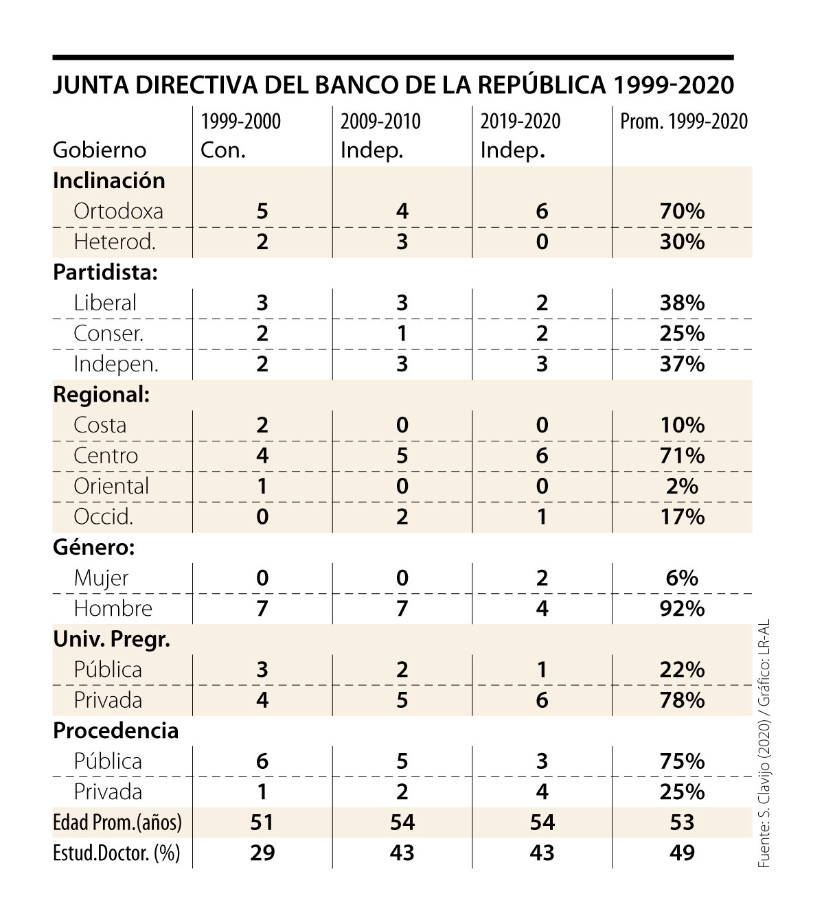 El cuadro adjunto resume la estructura que ha tenido el cuerpo directivo del BR durante 1999-2020, incluyendo allí al MinHacienda. Lo primero que cabe destacar es que sí resultó posible reducir la inflación a la franja de largo plazo de 2%-4% anual, tras flotar la tasa de cambio, y sin deshacerse del MinHacienda.
