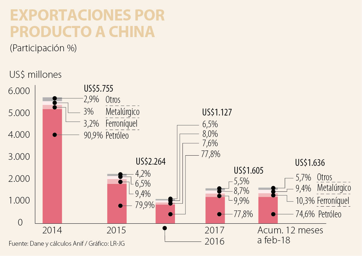 Es claro que Colombia podría beneficiarse de pertenecer a la AP a través de las acumulaciones de origen con países pertenecientes a la AP. Sin embargo, esto requiere primero generar encadenamientos productivos al interior de dicho bloque (ver Comentario Económico del Día 3 de diciembre de 2015). Todo lo anterior explica por qué las exportaciones colombianas hacia China tan solo bordean los US$1.700 millones (acumulado doce meses a febrero de 2018), ver gráfico adjunto. Allí el petróleo participa con 75% del valor exportado y el conjunto commodities representan 94% de las ventas. ¿Cuál diversificación exportadora?