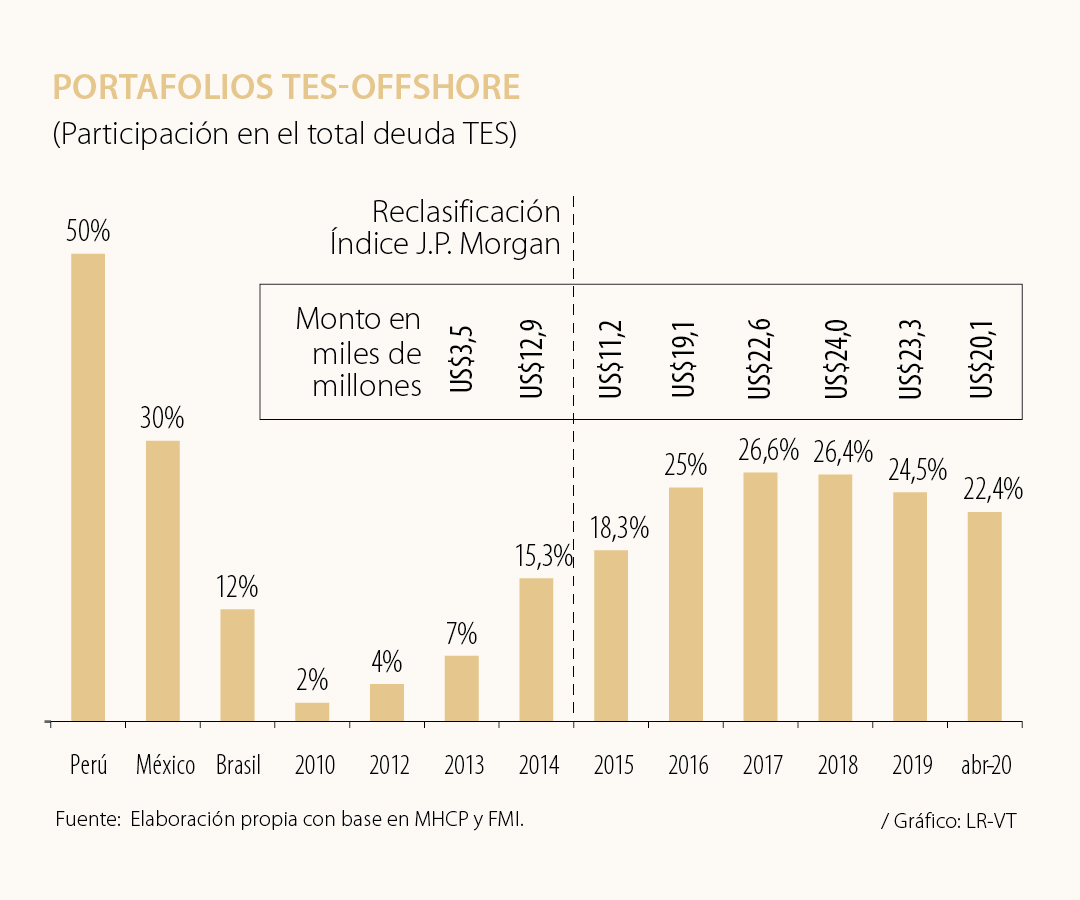 ¿Será que las pandemias también sirven para re-escribir las historias fiscales y monetarias de Colombia? ¿Se imaginan Uds. el negativo impacto de este esquema sobre ahorradores del sector privado relacionados con el futuro pensional? Y, en el corto plazo, se generaría una estampida de tenedores de bonos-TES del off-shore que han venido alimentando 25% de ese mercado (ver gráfico adjunto).