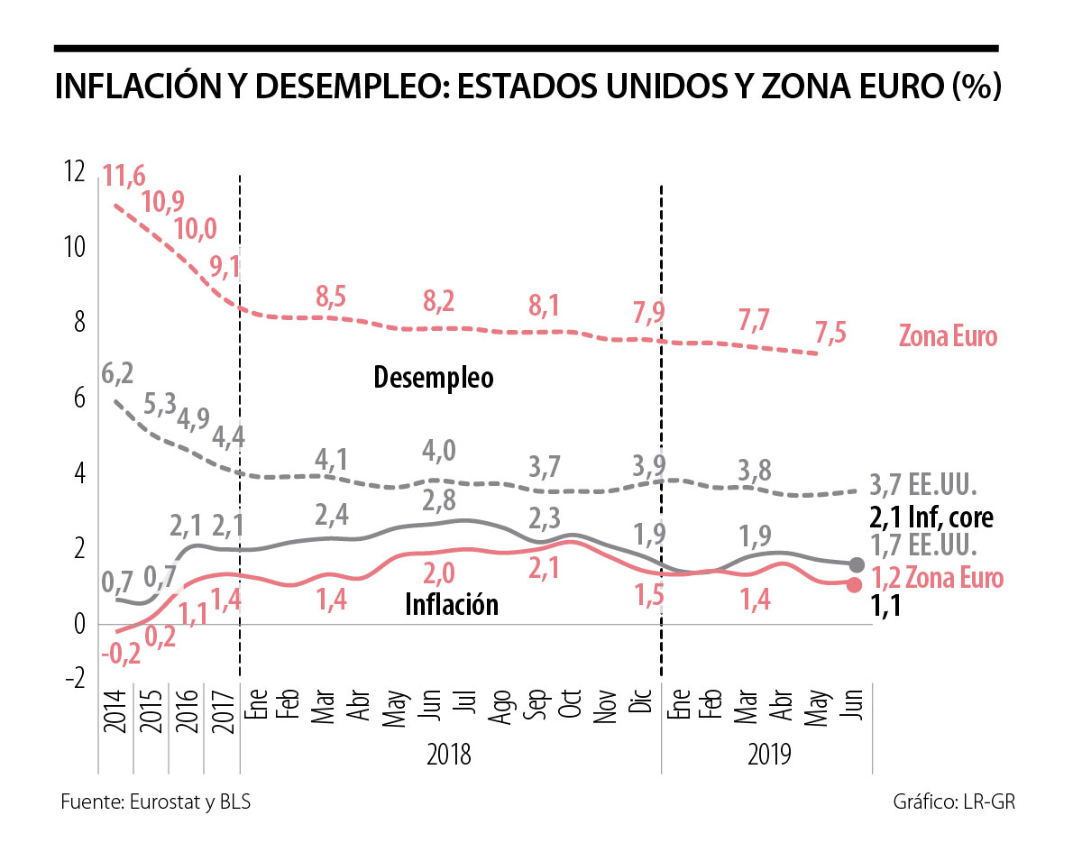 En el caso particular de los Estados Unidos, la desaceleración de su PIB-real estaría marcando una trayectoria que pasaría del 2.9% logrado en 2018 hacia un 2.4% en 2019 y eventualmente un 1.7% en 2020, lo cual políticamente pondría en dificultades la reelección de Trump. Sin embargo, la trayectoria del desempleo, bajando del 4.5% en 2017 hacia 3.7% actualmente, difícilmente hubie- ra justificado este recorte de la tasa repo de la Fed en la medida en que estos registros son los mejores del último medio siglo. De hecho, la generación de empleo continúa promediando los 200.000 puestos/mes, implicando satisfactorios ritmos de crecimiento del empleo de 1.2% anual. Algo similar ha venido ocurriendo en Europa, con satisfactorios desempeños en crecimiento-empleo durante 2017-2019 (ver gráfico adjunto).