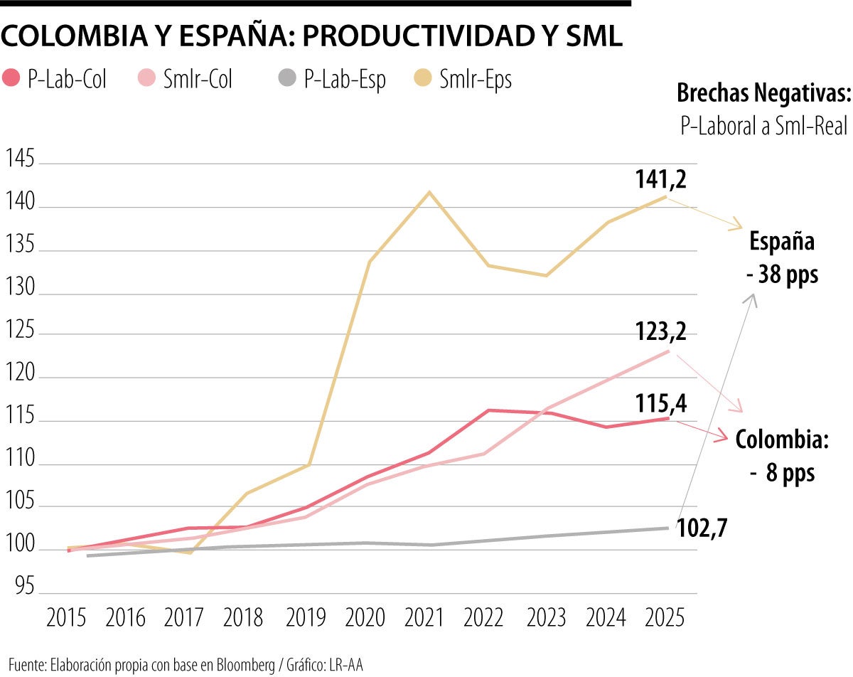 Pero en el caso de Colombia la incidencia del SML llega al 65% de los trabajadores formales y esto ha venido generando “una doble brecha laboral”: no solo se ha exacerbado la inercia salarial en Colombia, atada a la inflación, también sino que la productividad laboral crece lentamente a ritmos promedio de 1% anual. Entre tanto, en los Estados Unidos se registran crecimientos de la productividad laboral a ritmos promedio del 2,5% anual. Solo en los años recientes (2023-2024) se ha observado un reajuste salarial medio que en Estados Unidos supera la productividad laboral, lo cual es coherente con su apretado mercado de trabajo, con tasas de desempleo cercanas al 4,3%.