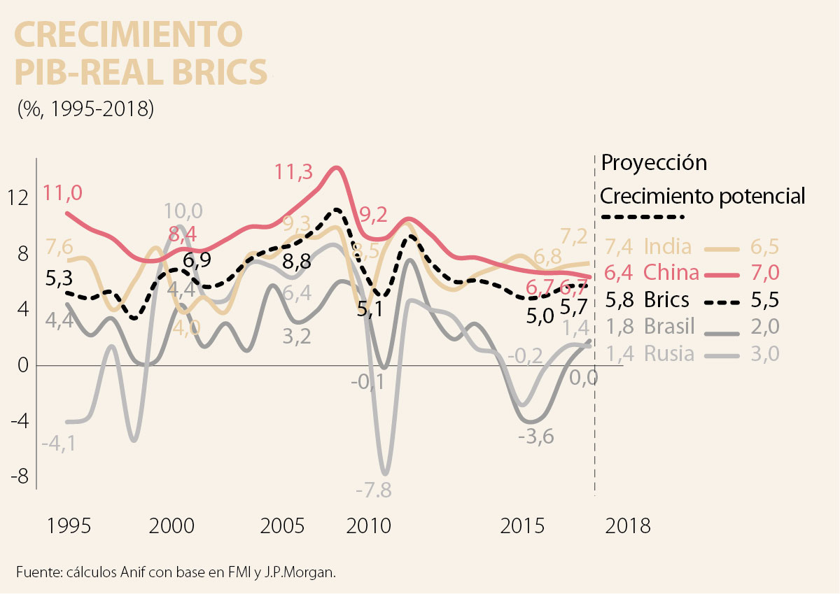 No cabe duda de la importancia de los Brics a nivel macro- global, pues ellos representan 40% de la población y manejan una proporción similar de las Reservas Internacionales. A nivel de flujos, dichos Brics explicaron 40% de la expansión del PIB-real durante 2000-2008 y hasta 50% de ella en momen- tos de desaceleración del mundo desarrollado. Diversos modelos señalan que su actual participación en el PIB mundial se estará estabilizando hacia un 40%-45% antes de 2050.