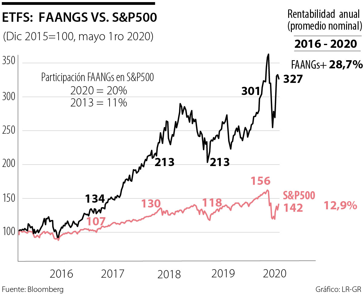 Al corte de marzo de 2021, la rentabilidad accionaria del índice S&P500 bordeaba el 50% anual (un 30% impulsado por tecnológicas y farmacéuticas). Y la rentabilidad del índice Nasdaq se valorizaba a ritmos del increíble 70% anual impulsado por la alta tecnología-digital de Facebook, Apple, Amazon, Netflix, Google y Microsoft (conocidos como los Faangm, ver gráfico). Estas rentabilidades claramente denotan la existencia de una burbuja accionaria.