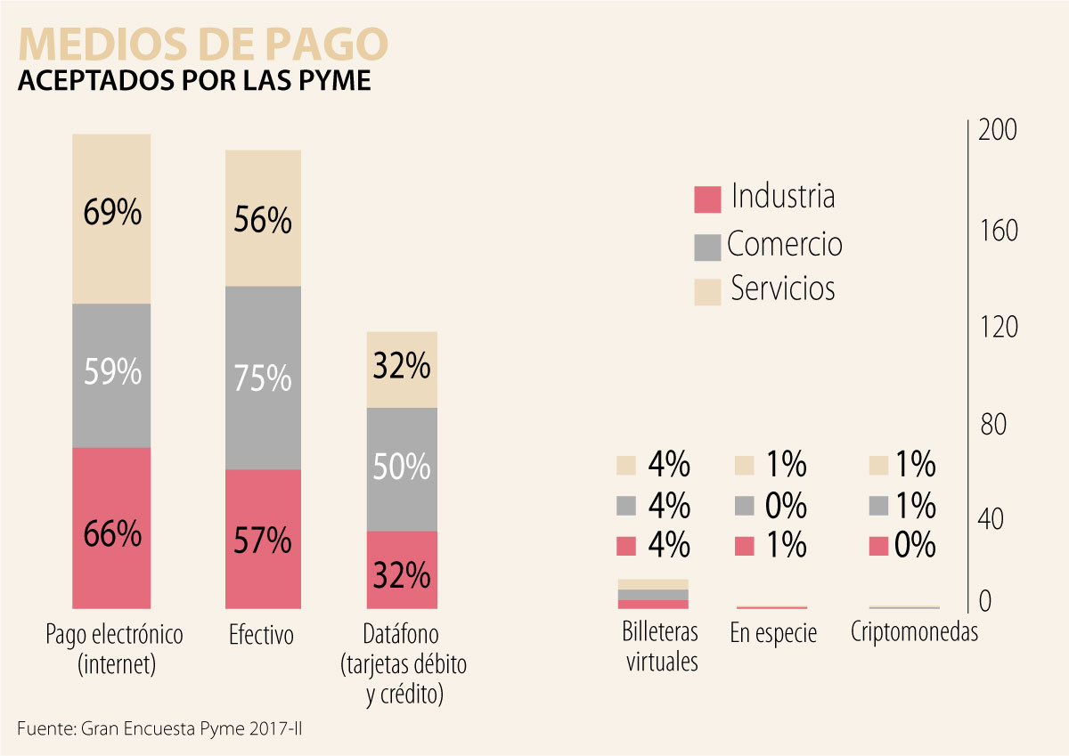 Lo sorpresivo de estas respuestas de los empresarios Pyme también se deriva de que estas distan de las preferencias en el modo de pago de los consumidores. En efecto, según cálculos recientes del Banco de la República (2018), el 92,4% de los ciudadanos prefiere realizar sus operaciones de compra de bienes y servicios en efectivo, seguido por el pago con tarjetas de débito con el 5,8% y las tarjetas de crédito con el 1,3%. Así, habría un desalineamiento entre los medios de pago que ofrecen las Pyme (la oferta) y la forma de pagar que usan los consumidores (la demanda).