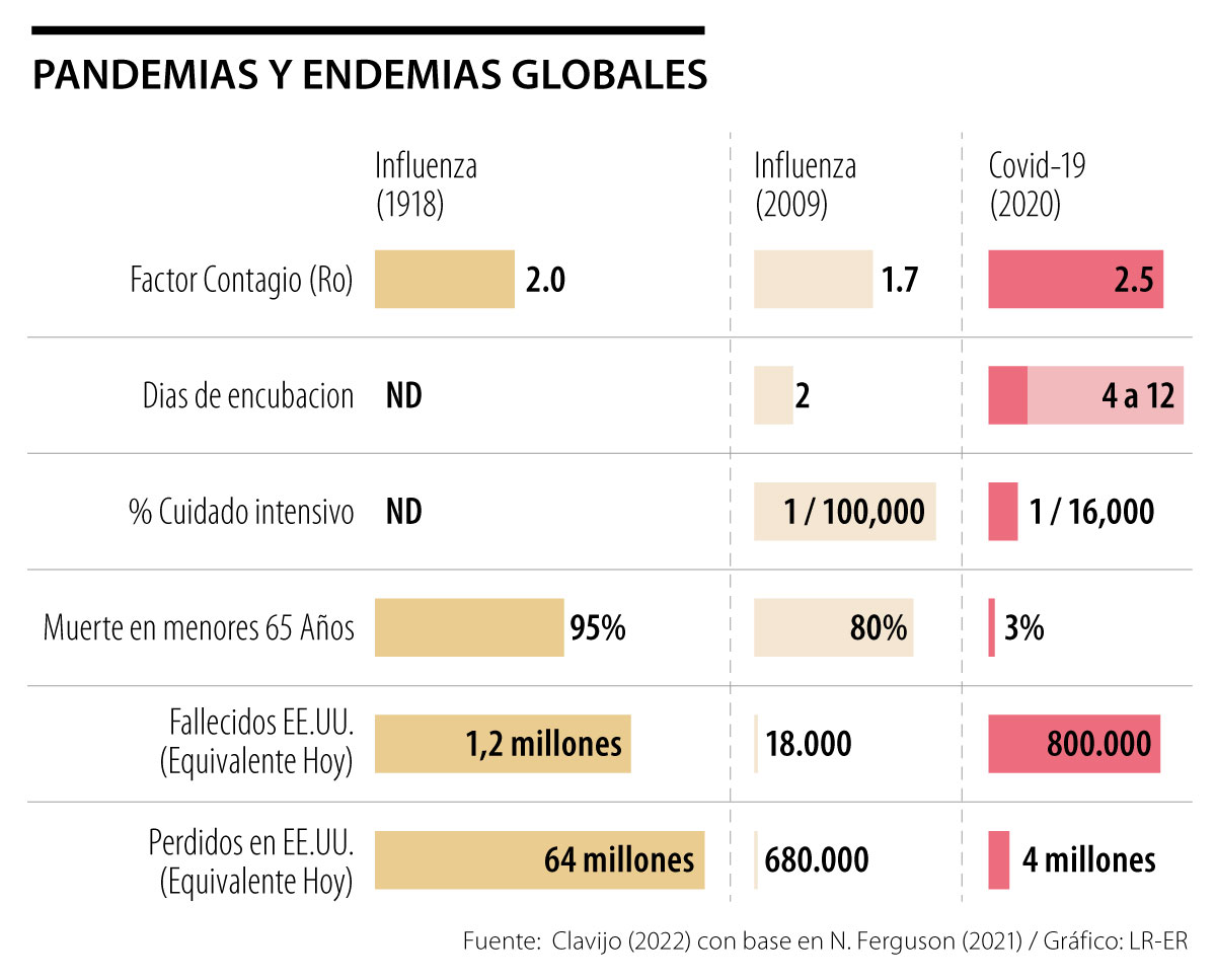Este problema se agrava cuando aparecen pandemias como la Covid 2020-2022, dejando cerca de 850,000 fallecidos en solo Estados Unidos (10 veces más muertos que los dejados por la “flu” anual) y 5.5 millones a nivel global. Según Niall Ferguson (2021, “Doom”), este problema de esparcimiento de virus altamente contagiosos ya tenía un historial que ameritaba que los países avanzados estuvieran mejor preparados. Los sondeos (2019) dejaban entrever que dicha “flu” causaba unas 4 millones de muertes anuales a nivel global de forma “algo silenciosa”. Los factores epidemiológicos asociadas a ella prendían alarmas sobre sus mutaciones con serias consecuencias. El cuadro adjunto ilustra cómo su factor de contagio 1.7 (Ro) resultaba similar al de la pandemia de un siglo atrás y con 80% de fallecidos menores de 65 años.