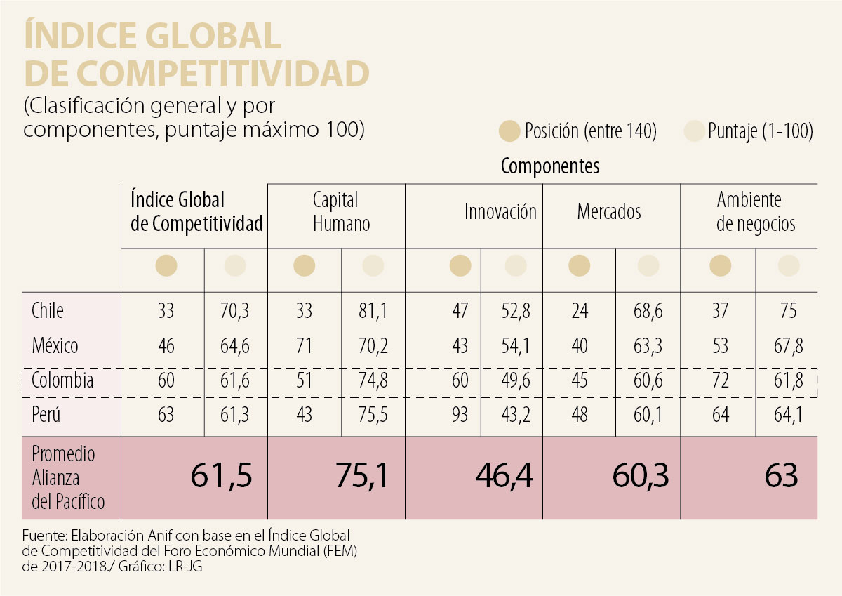 Comentábamos hace poco cómo, en el más reciente Reporte de Competitividad Global (RCG) del Foro Económico Mundial de 2017-2018, Colombia se mantuvo estancado en calificaciones de 62/100 (deteriorando su ranking relativo de la posición 57 hacia la 60 entre 140 países). Ello implica que Colombia continúa rezagada en estos temas clave de competitividad frente a pares de la Alianza del Pacífico (AP) como Chile (posición 33) y México (46), y solo supera marginalmente a Perú (63).