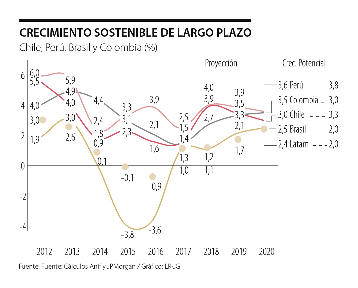 Este grupo de Alianza del Pacífico ha tenido relativo éxito en dejar atrás los pobres crecimientos de 2% anual del período 2015-2017 y debería perfilarse hacia crecimientos de 3,5% en 2019-2020. No obstante, estas son cifras aún insatisfactorias respecto de su potencial histórico del 4,5% anual.