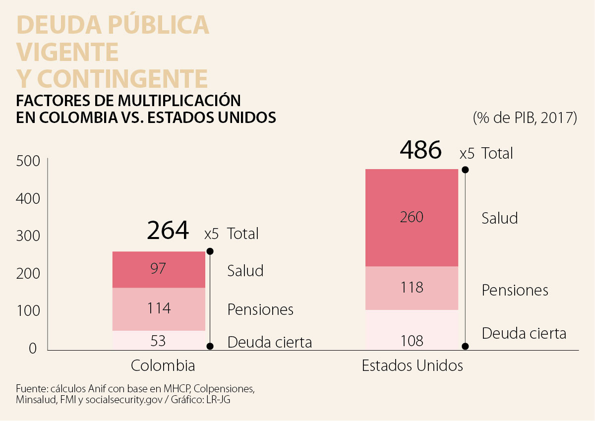La insostenibilidad financiera del sector salud se ha hecho más evidente durante 2014-2018, ahora agravada por cuenta de la Ley Estatutaria que ha validado las problemáticas estructurales de universalización y homologación de los servicios (con un “POS ampliado”). Ello resulta preocupante, desde la óptica fiscal, si se tiene en cuenta que la deuda pública vigente y contingente de Colombia llega a 264% del PIB (= 53% de deuda explícita + 97% de pasivo en salud + 114% de pasivo pensional). Nótese cómo el valor de dicha deuda total multiplica por cinco la deuda pública vigente.