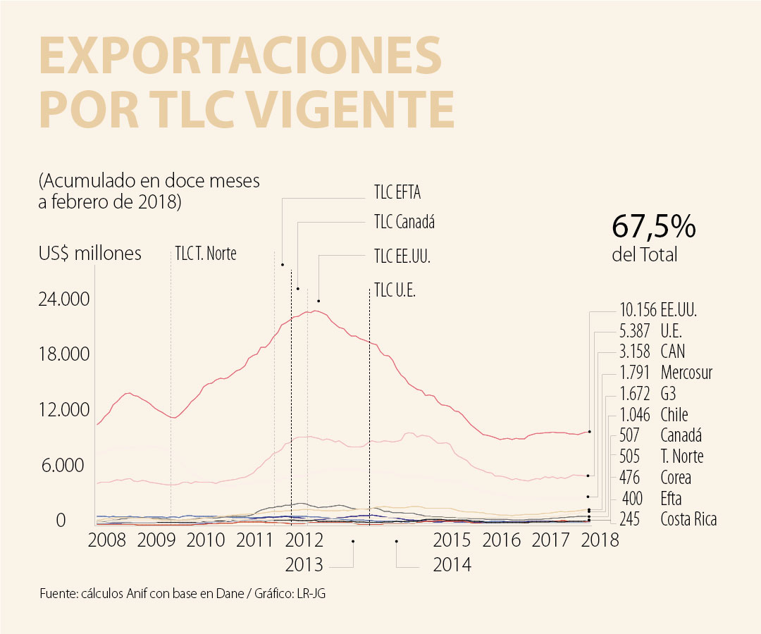 El TLC con el EFTA también tuvo un balance exportador positivo por ganancias en el sector minero. Con Canadá se recuperó el potencial exportador durante 2017, debido al desempeño de las exportaciones metalúrgicas . EE.UU. (el principal socio comercial) mantuvo su balance exportador en -1, dejando en evidencia el limitado aprovechamiento con ese país. Entre tanto, el TLC con el G3 exhibió las mayores ganancias en competitividad exportadora en los sectores minero, de refinación de petróleo y alimentos. El TLC con Corea del Sur mantuvo su balance negativo, mientras que la Zona Euro como el Mercosur mostraron mejoras marginales en los sectores metalúrgico y textilero, respectivamente. A pesar de ello, estos últimos dos siguen representando los mayores riesgos para el país con los balances más desfavorables para Colombia.