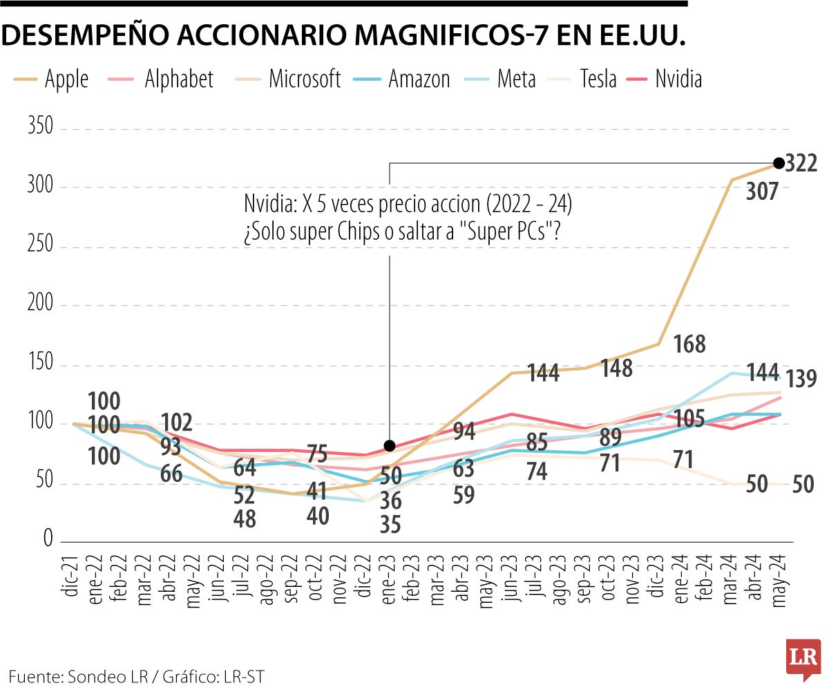 Curiosamente, lucen mas protegidas las actividades operativas-físicas asociadas con el mundo de los servicios y el entretenimiento que las “tareas-esenciales”, antes asociadas con el conocimiento. Si ese conocimiento es de tipo repetitivo, resulta que Big-Brother lo hará pronto mas rápido, a menor precio, y con el simple apoyo de algoritmos en la nube, cuyo costo de procesamiento va reduciéndose a la velocidad de la Ley de Moore. Ver, Miller (2023, “Chip War”). Decíamos que el impacto de Visores-3D todavía es incierto y que dependerá de los usos que se vayan descubriendo en el futuro cercano, gracias a la experimentación que Apple ha recientemente lanzado, cuya acción ha mermado su valorización (ver gráfico adjunto).