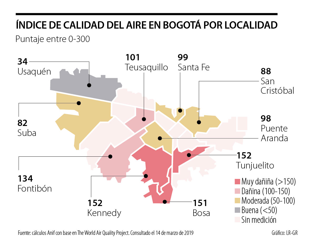 El problema de alta contaminación ambiental ya no se limita a Bogotá y Medellín, sino que se ha extendido de forma preocupante a ciudades intermedias como Pereira o Bucaramanga. Las emergencias de deterioro respiratorio han requerido decretar horarios extendidos de inmovilización de vehículos tanto privados como de carga y cubriendo los fines de semana. La calidad del aire en Bogotá ahora registra varias zonas en la franja 50-100 de contaminación moderada y por lo menos 3 zonas de contaminación alta.