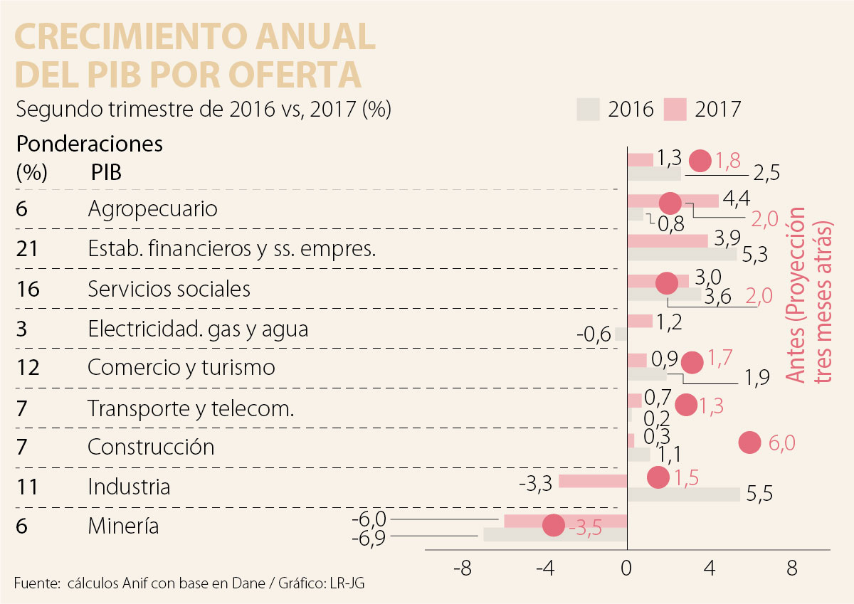 El Dane reveló que el PIB-real de Colombia se expandió a un pobre ritmo del 1,3% anual durante el segundo trimestre de 2017 (vs. 2,5% un año atrás). Esta cifra resultó inferior al pronóstico que venían manejando Anif, el mercado y el Banco de la República (BR), cercano al 1,6% anual. Nótese que dicha cifra ni siquiera alcanzó el piso del rango (1,6%-2,1%) que venía proyectando Anif con base en los indicadores líderes de un trimestre atrás.