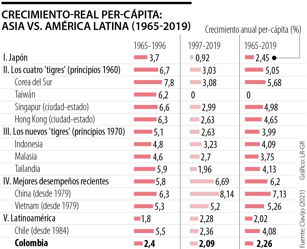 Los mejores desempeños recientes (1979 en adelante) corresponden a China, acelerándose de 6% anual (1979-1996) a 8% (1997-2019), y con un impresionante promedio de 7% anual. Esta última cifra ha implicado duplicar su ingreso-real per-cápita cada década. Vietnam ha hecho algo similar al sostener tasas de 5% real per-cápita desde 1979, con duplicación cada 14 años.