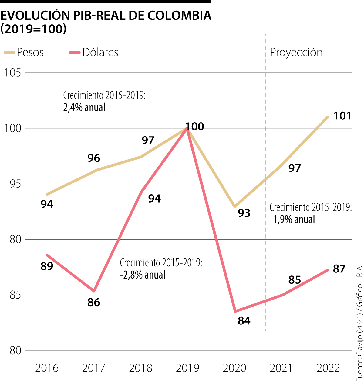 La historia de la desaceleración del PIB-real de Colombia es aún más dramática al computarla en dólares, lo cual refleja ese otro fracaso exportador del país, todavía centrado en un 60%-70% en commodities energéticos. El gráfico muestra cómo esos niveles de producción en dólares cayeron al 84% respecto del observado en 2019 y tan solo estarían llegando al 87% en el 2022. Esto como resultado de esa doble combinación de contracción del producto y devaluaciones que habrán acumulado en promedio pérdidas de 20% durante 2020-2022, adicionales al 50% de caída nominal peso-dólar del periodo 2015-2019.