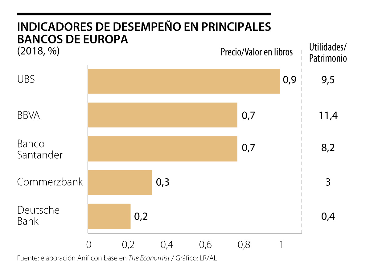 Ahora bien, las debilidades de capital y los bajos retornos patrimoniales son factores comunes casi para todos los bancos de la Zona Euro. Por ejemplo, el UBS arrancó 2019 con uno de sus peores desempeños, dada su alta dependencia sobre los mercados financieros de Estados Unidos, habiendo acortado su músculo de banca tradicional en Europa. Al igual que el Deutsche Bank, UBS está teniendo que replantear su estrategia al contraer sus ingresos de banca de inversión en los Estados Unidos. Si bien es cierto que UBS lucía bien a lo largo del 2018, obteniendo retornos patrimoniales cercanos a 10% y relaciones Precio/Valor libros casi unitarias, ahora enfrenta momentos tensionantes frente a la desaceleración económica de la Zona Euro (ver The Economist, “A marriage made in misery”, marzo 2 del 2019).