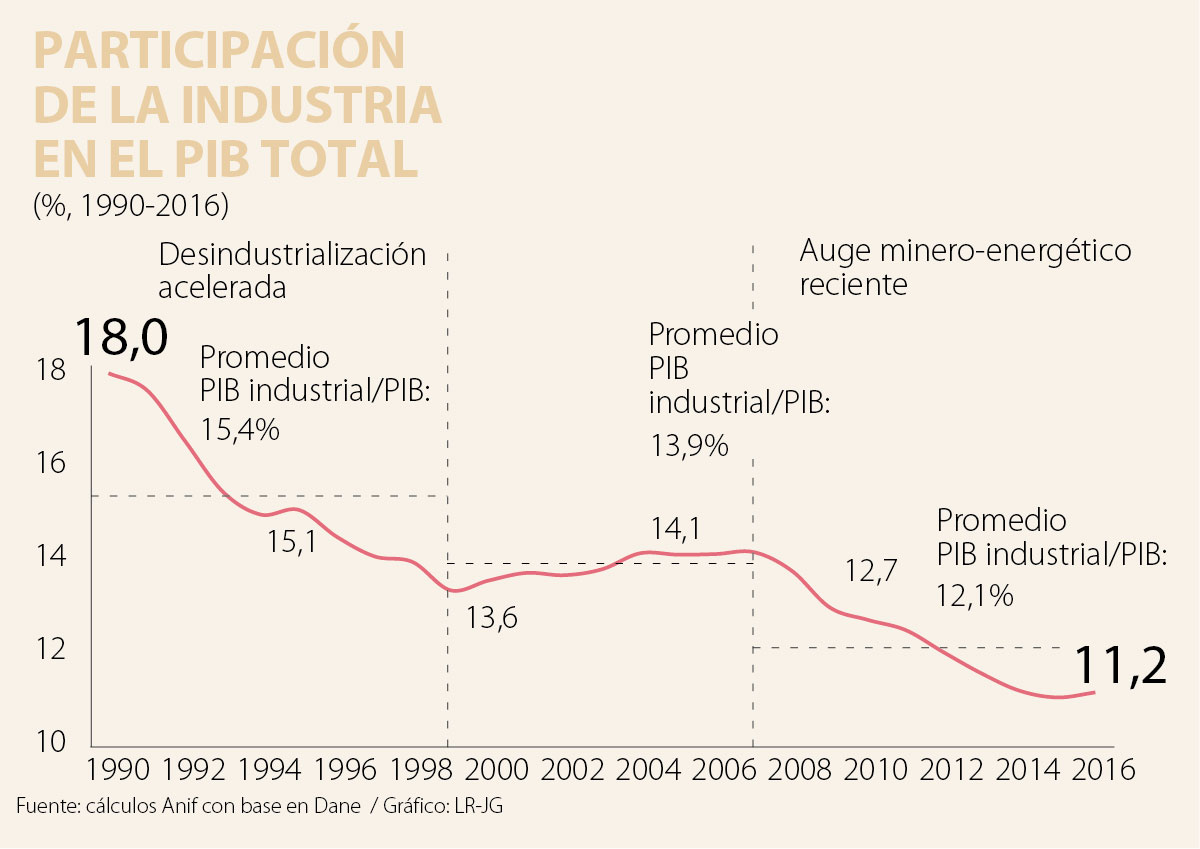 Anif ha venido señalando que la industria colombiana atraviesa por una preocupante crisis, encubada durante los años de “Enfermedad Holandesa” del período 2005-2014 y la cual ha persistido durante 2015-2017.