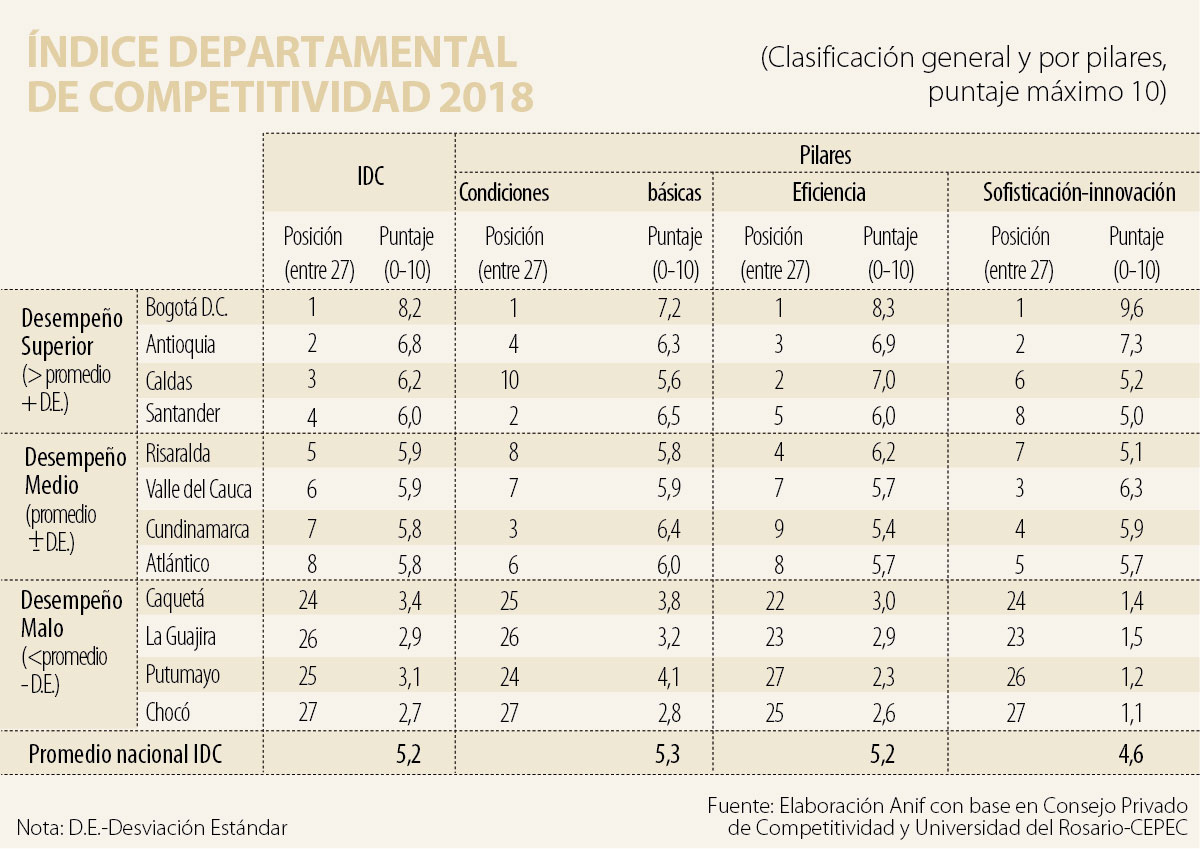 De las economías más representativas de Colombia, Valle del Cauca (5,9 vs. 5,7), Cundinamarca (5,8 vs. 5,5) y Atlántico (5,8 vs. 5,5) recibieron las calificaciones más bajas. Allí pesó el mal desempeño del pilar de eficiencia (5,7, 5,4 y 5,7, respectivamente), presionado por el bajo nivel de desarrollo de los mercados financieros.