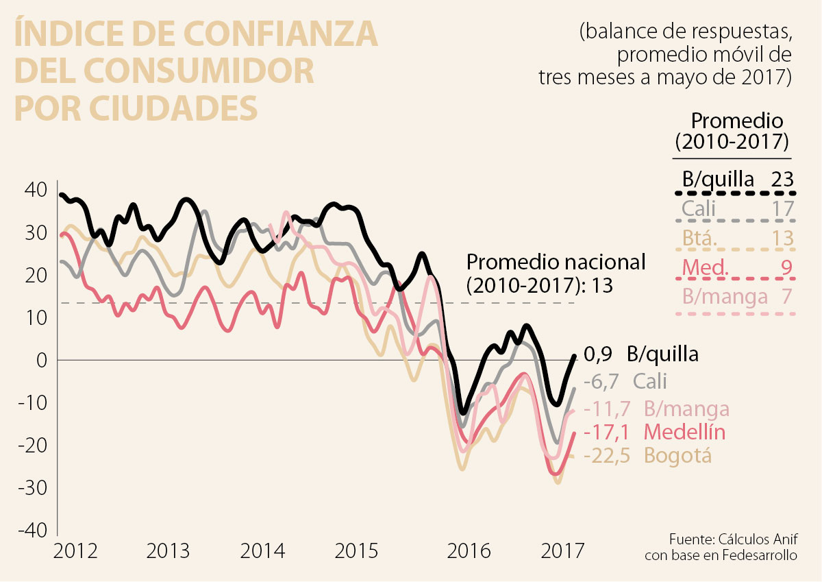 Posteriormente se ubicaron Medellín (-17,1 a mayo de 2017 vs. +8,7 en el promedio histórico 2010-2017) y Bucaramanga (-11,7 vs. +6,9), seguidos de Cali (-6,7 vs. +16,8) y Barranquilla (+0,9 vs. +23,3). No obstante, cabe resaltar que dichas cifras representan una recuperación frente a lo observado en enero-febrero de 2017, cuando el ICC alcanzó niveles mínimos históricos en todas las ciudades.
