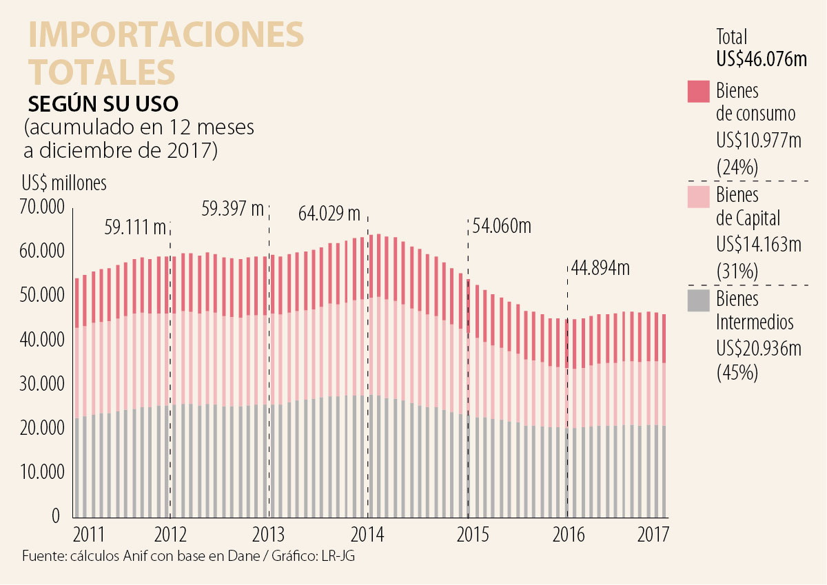 Ahora bien, los datos más recientes, publicados por el Dane, señalan que las importaciones en los últimos 12 meses a febrero de 2018 sumaron US$46.445 millones (CIF), expandiéndose todavía a tasas “moderadas” del 3%. Dicho desempeño de las importaciones se encuentra en línea con el pobre rebote en crecimiento que la economía estaría teniendo a lo largo de 2018 (2,3% anual proyectado por Anif).