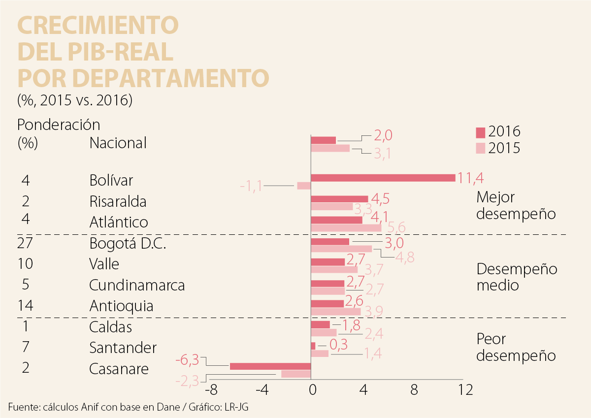 A mediados de 2017, el Dane reveló el comportamiento del PIB real departamental de Colombia para 2016. Como ha sido usual, los resultados regionales exhiben una gran heterogeneidad frente al resultado agregado del país. En esta ocasión, fue principalmente el sector de la construcción el que causó las marcadas diferencias en el crecimiento entre regiones. Por ejemplo, mientras este se expandió un 28% en Risaralda, registró un pobre crecimiento de 0,2% en Caldas y una contracción de 0,5% en Santander.