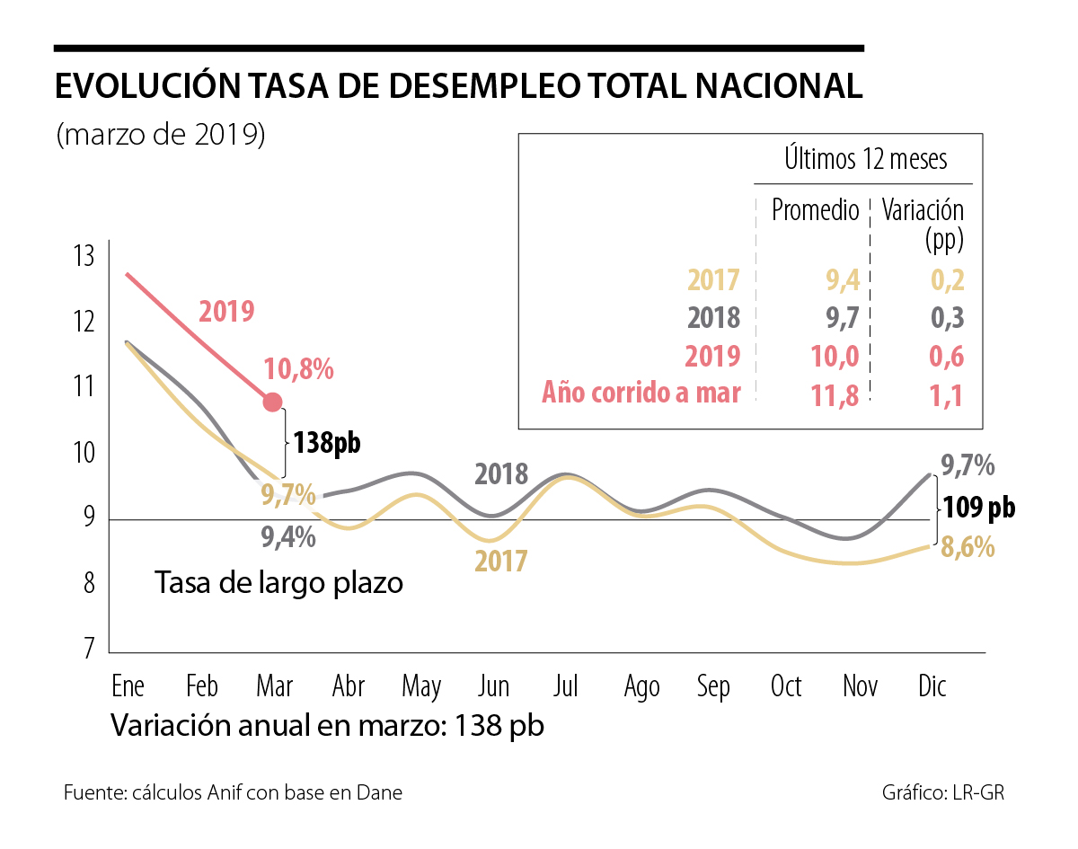 Nótese que la cifra reportada por el Dane, de 2,8% anual, ni siquiera alcanzó el valor-piso del rango de pronóstico de Anif (3% a 3,7%) para este primer tri- mestre de 2019 (siguiendo la batería de “indicadores líderes” de tres meses atrás). Infortunadamente, este regular desempeño del PIB-real del primer trimestre viene a ratificar la de- bilidad de la demanda agregada, ahora conjugada con un deterioro de +1 punto porcentual (pp) en la tasa de desempleo nacional (enero-marzo), poniendo en seria duda la posibilidad de llegar a reducirla respecto de 9,7% que promediara en 2018.