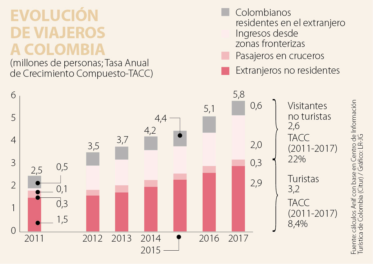 Sin embargo, la cifra de turistas propiamente dichos (excluyendo a colombianos residentes en el exterior y personas provenientes de zonas fronterizas, en su mayoría venezolanos) tan solo bordeó los 3,2 millones en 2017, aunque esta cifra también arrojó un incremento del 9,9% frente a los 2,8 millones de un año atrás.