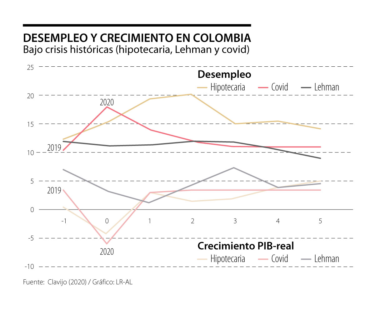 Si bien el deterioro del mercado laboral bajo covid (2020-2021) no será ni tan pronunciado ni durará tanto como ocurrió en la crisis hipotecaria (1998-2003), la situación laboral de Colombia continuará siendo muy precaria en pos-pandemia. Esta pandemia estará dejando cicatrices sectoriales en aviación, turismo, hotelería y entretenimiento. Claramente estos sectores deberán adaptarse (como los que más) a la nueva situación hasta que se logre la vacunación masiva durante 2021-2022.