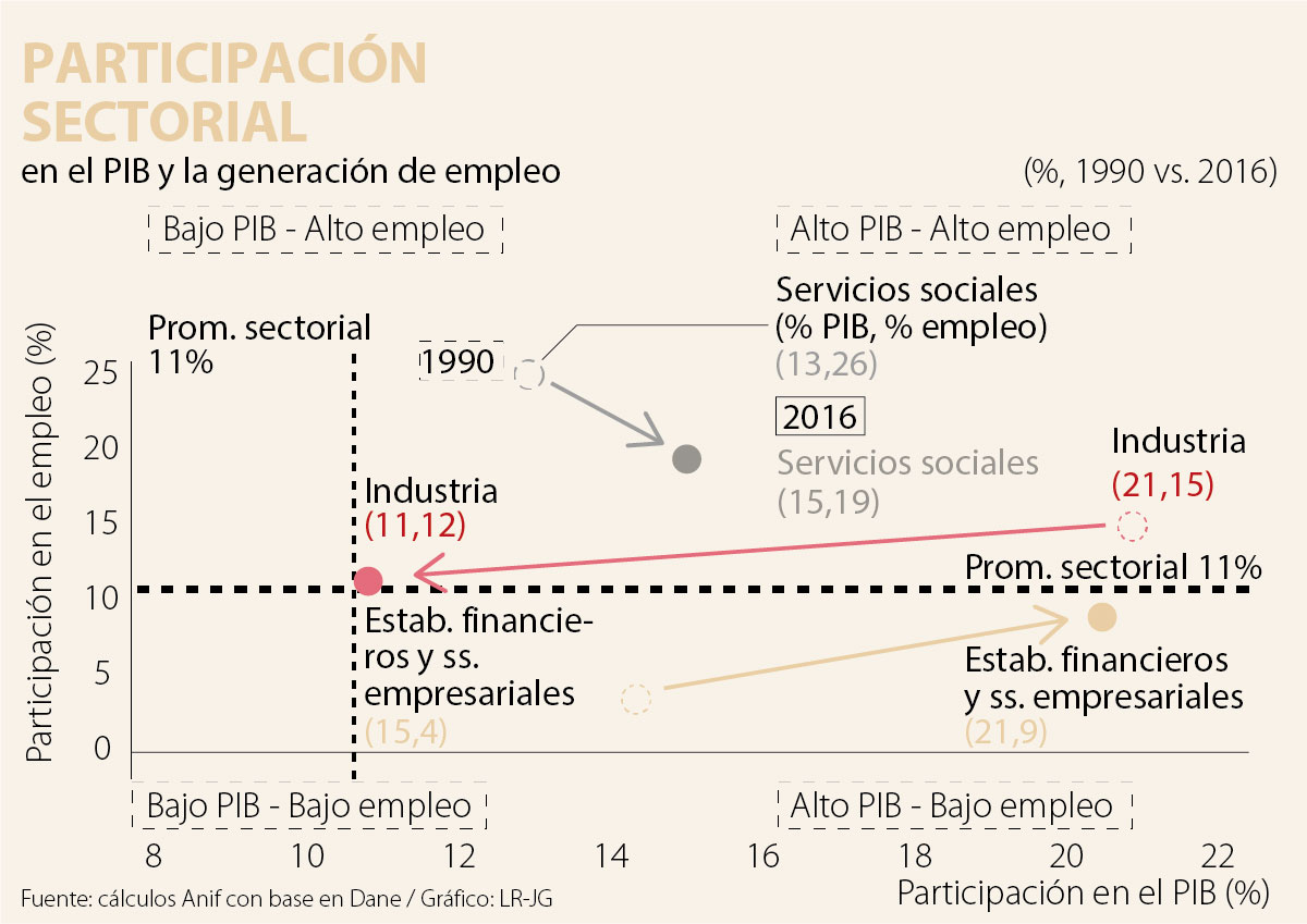 Siguiendo la teoría de Baumol sobre la “enfermedad del costo sectorial” (antes explicada), la expansión de largo plazo del PIB-real y del empleo se ha dado en los sectores de servicios. Por ejemplo, en los casos de aquellos relacionados con los servicios sociales, se tiene que se han expandido de 13% hacia 15% en sus aportes al PIB-real durante los últimos 25 años, mientras que la absorción de mano de obra ha disminuido de 26% a 19% (aunque todavía registrando una participación muy superior al promedio sectorial de 11%). Por su parte, en los servicios que contienen intensidad tecnológica, como los servicios financieros, se han incrementado los aportes al PIB-real de 15% a 21%, a la vez que los aportes en mano de obra han pasado de 4% a 9% durante 1990-2016 (todavía por debajo del promedio de 11%).