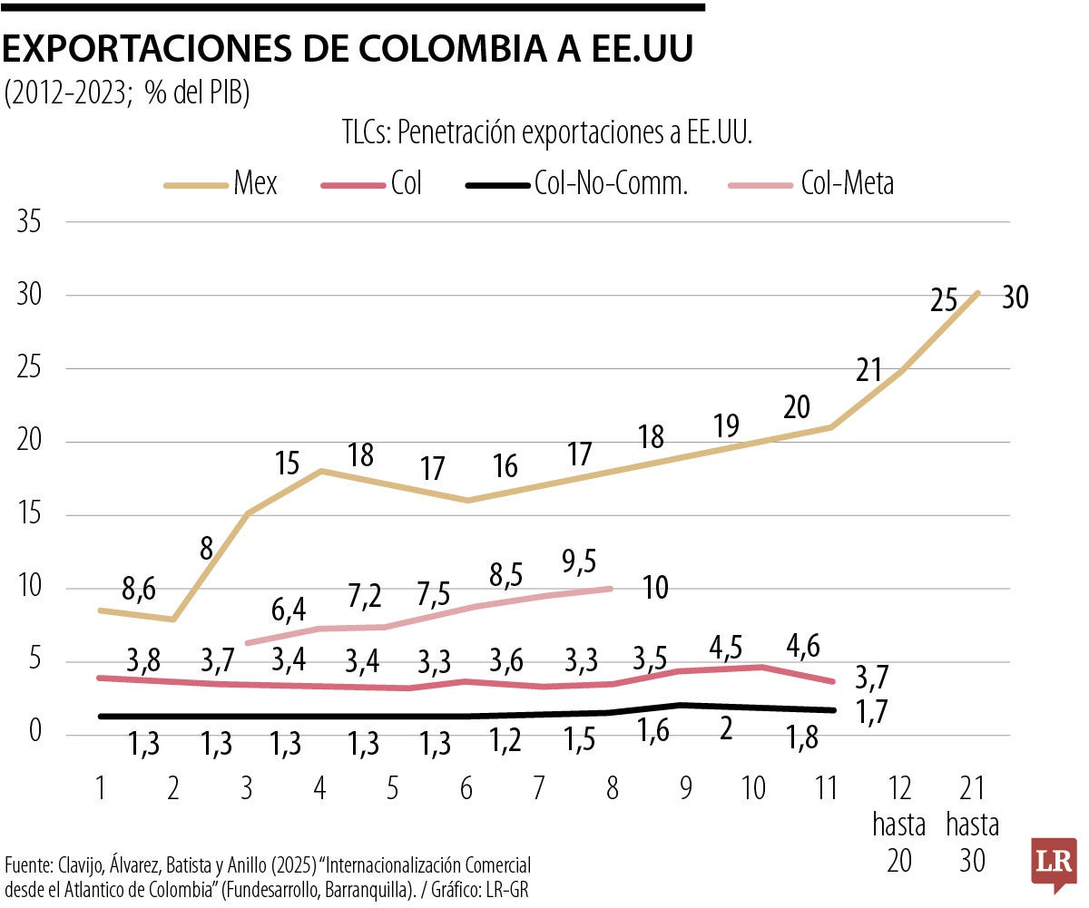 En particular, su estrategia de seguimiento propone focalizarse en: i) los detalles de alistamiento y desempeño exportador de Colombia; ii) avances en la agenda de infraestructura multimodal; iii) identificación sectorial-local con base en factores de éxito (logístico, tecnológico, comercial), conducente a una matriz y su determinación potencial (ComTrade); y iv) mejor aprovechamiento de financiamiento exportador y oportunidades apoyadas en zonas francas, “near-shoring” y experiencias en “Fábricas de Productividad”, donde el Atlántico de Colombia podría desempeñar un papel crucial dada su estratégica ubicación.