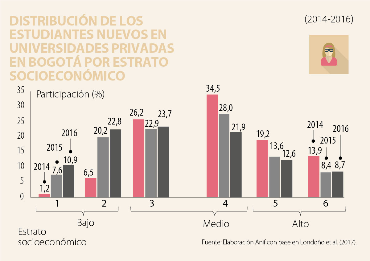 Los hallazgos iniciales de Londoño et al. (2017) sugieren que la implementación de SPP permitió: i) elevar de 40% a 70% la probabilidad de llegada a las IES acreditadas para la población beneficiada; ii) aumentar la participación de estudiantes de estratos 1-2 de 7% a 33% en el total de nuevos matriculados en IES privadas en 2014-2016 (ver gráfico adjunto); iii) elevar la participación de 12% a 18% de estudiantes de bajos recursos en el primer decil de las pruebas Saber 11 (muestra de un importante “efecto aspiracional”); y iv) reducir la probabilidad de deserción estudiantil.