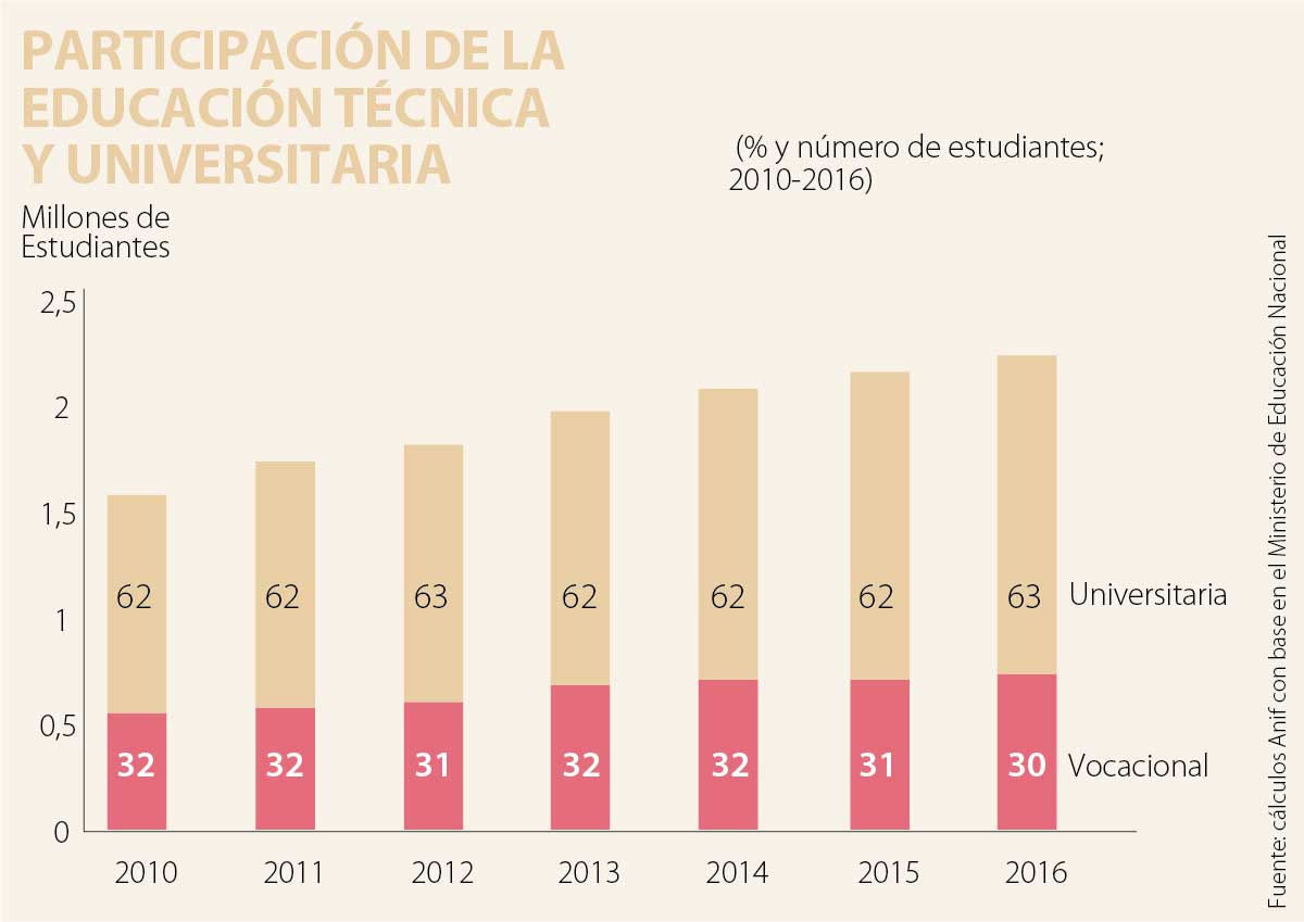 Con relación a la educación tecnológica en Colombia, esta ha mostrado avances importantes. En particular, la tasa de crecimiento anual (2012-2015) de matriculados al Sena ha sido del 10,5%, con un total de 425.847 estudiantes matriculados en 2015. Sin embargo, cabe anotar que ha habido toda una polémica por la forma de contabilizar dichos matriculados, pues se han venido refiriendo simplemente a la toma de algún curso, pero no propiamente a la carrera vocacional en sí misma.