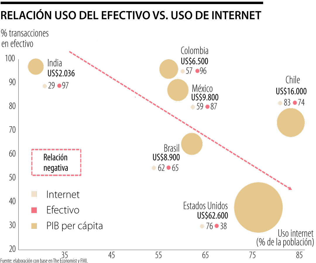 En México también prevalece la informalidad laboral y la elevada penetración del narcotráfico, lo cual hace que con una penetración del internet de 59% (similar a la de Colombia) se tenga también un alto uso del efectivo de 87% (solo marginalmente inferior a la observada en Colombia). En cambio, el factor cultural pro-formalidad de Chile se refleja en que el uso del efectivo es de 74%, lo cual de alguna manera va acompasado con su mayor penetración del internet al llegar a 83% (superando inclusive la cifra de penetración en los Estados Unidos).