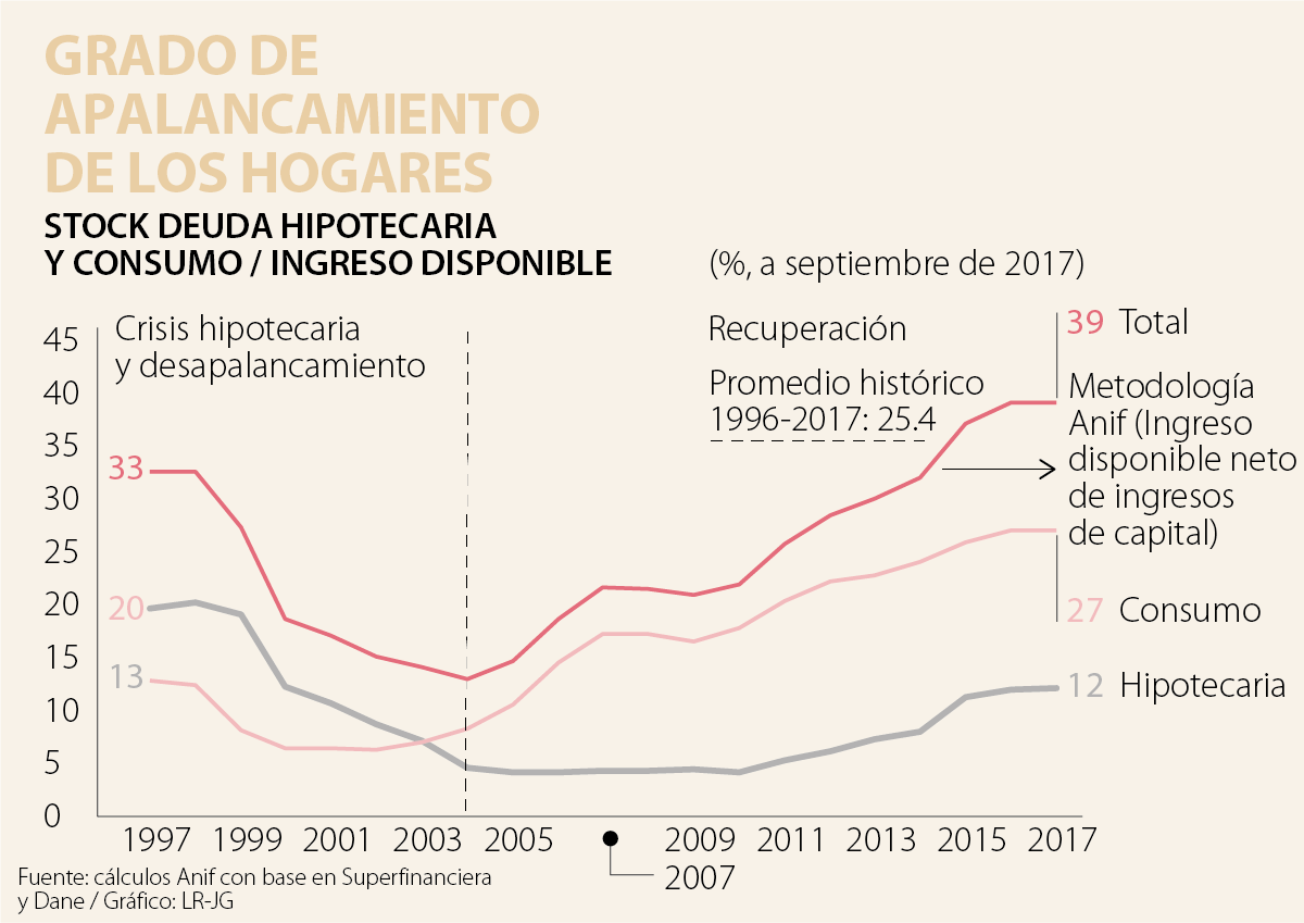 Esta coyuntura de alzas en el desempleo urbano, deterioro de la car- tera y baja transmisión de la política monetaria es especialmente preocu- pante para el servicio de la deuda de unos hogares que se encuentran en el pico histórico de endeudamien- to. En efecto, el grado de apalan- camiento, medido como la relación [Cartera Consumo + Cartera Hipote- caria] / (Ingreso Disponible) bordea el 40%, su pico histórico (ver gráfico 3), primordialmente afectado por el in- cremento del endeudamiento en consumo (27% del ingreso disponible actualmente vs. 13% en 1997) fren- te a los descensos en la hipotecaria (12% actualmente vs. 20% en 1997).