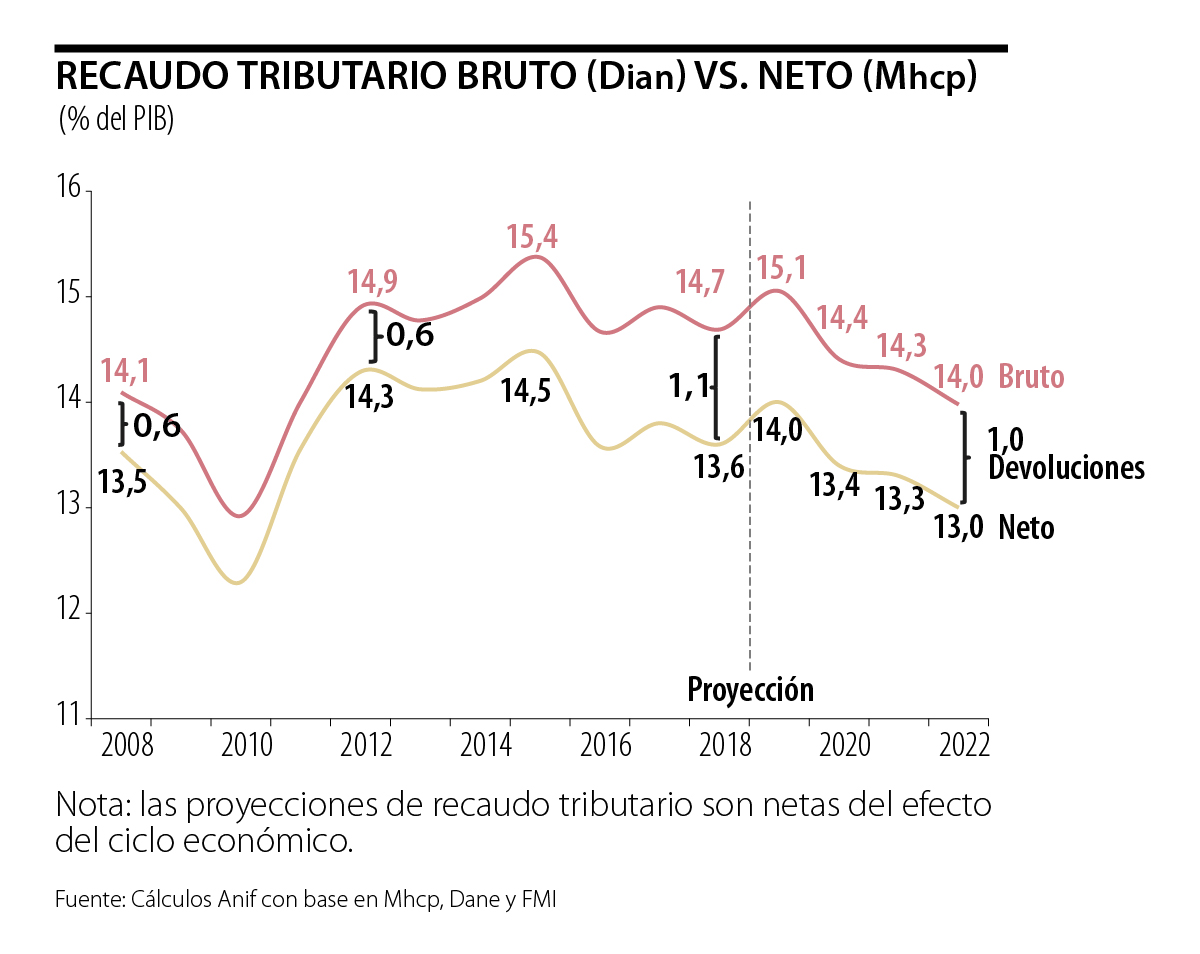 Esta cifra de recaudo neto no se compagina con las celebraciones de supuestos sobrecumplimientos en gestión tributaria de la Dian, ni tampoco con la meta, que llevamos ya cinco años persiguiendo, de elevar dicho recaudo a no menos de 15% del PIB. Continuamos con una peligrosa brecha (cercana a 2% del PIB). Nótese que esa diferencia de casi 1,1% del PIB entre recaudo bruto y neto corresponde al financiamiento que le da, por vía forzada, el sector privado al sector público a través del sobre-recaudo que después la Dian tiene que devolverle a hogares y firmas.