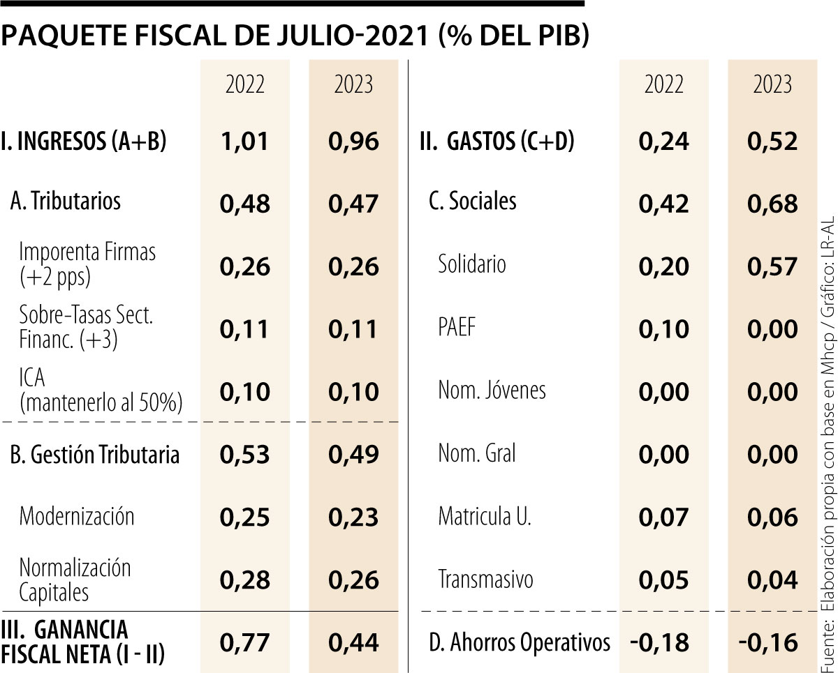 El Gobierno divulgó el paquete fiscal (2021-2022) que inició discusiones parlamentarias el pasado 20 de julio. Se trata de un ambicioso gasto social adicional, en buena medida resultante de la pandemia covid y de las graves protestas de abril-junio. Como era de esperarse, los ingresos adicionales no encierran mayor ambición de tipo estructural (habiéndose abandonado la profundización del IVA y la progresividad en renta de hogares medios-altos). Lo que sí resultó negativa sorpresa fue haber desechado el impo-riqueza de hogares a tasas moderadas (máximas de 1%) y desde patrimonios-netos de $3.000 millones, como habíamos venido sugiriendo (Clavijo, 2020; Fedesarrollo, 2021). Esto implicará perder recaudo por cerca de 0,2% del PIB y echar para atrás importantes avances en progresividad-tributaria, al tiempo que se había descartado también la renta presuntiva.