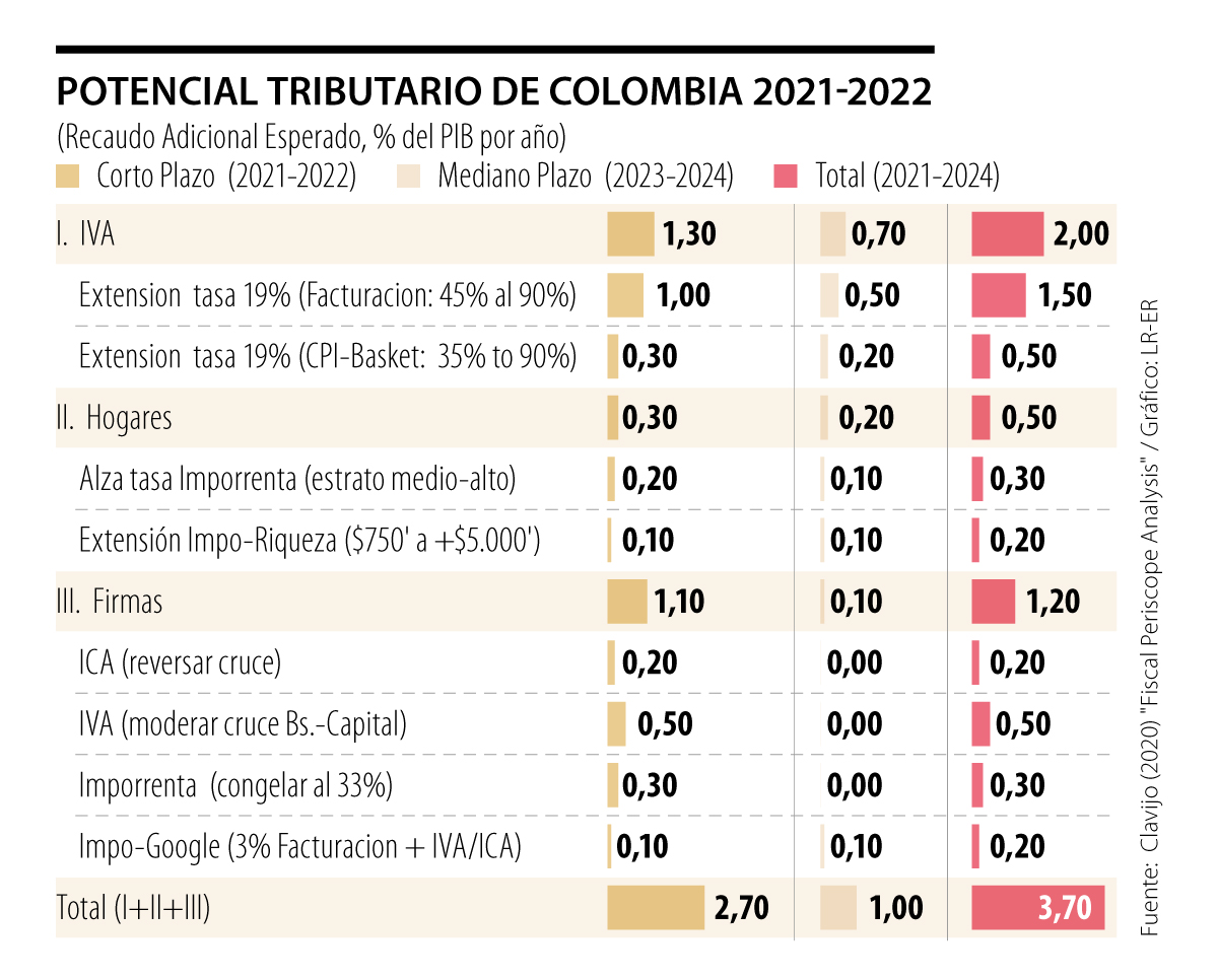 Una reforma de este tipo permitiría incrementar el recaudo en 2,7% del PIB en el corto plazo y hasta en 3,7% del PIB hacia el mediano plazo. Algunos pensarán que esta cifra luce baja frente a 6,6% del PIB de exenciones en solo IVA que reporta el Mfmp-2020, pero nuestros análisis sobre posible-frontera de gravamen no supera 2,6% del PIB para el caso del IVA.