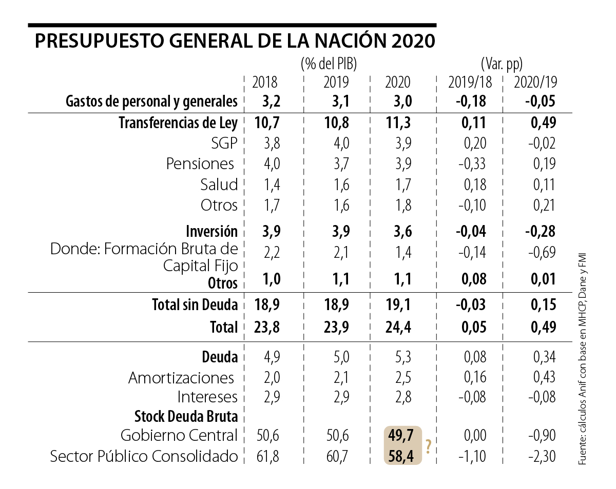 A finales de julio pasado, el Gobierno radicó ante el Congreso el Presupuesto General de la Nación para el año 2020 (PGN-2020). Previamente, el MHCP había informado que el Comité de la Regla fiscal le había permitido expandir el déficit del Gobierno Central (GC) de 2,2% del PIB (programado en 2017) hacia 2,7% del PIB para 2019 y de 1,6% del PIB hacia 2,3% del PIB para 2020. Así, dicho Comité ha validado un acumulado de déficit adicional del GC equivalente a 2% del PIB durante el período 2018-2022. Esta mayor laxitud fiscal obviamente implicará un incremento en la relación Deuda Bruta GC / PIB, en vez de descender como se afirma en cada ejercicio del Marco Fiscal de Mediano Plazo (Mfmp). Muy seguramente esa relación Deuda / PIB estará pasando de 44% en 2014 (cuando se adoptó dicha Regla) hacia 54% del PIB en 2022 (o a niveles superiores, al tener en cuenta la emisión de TES para pagar deudas flotantes de la salud y de demandas a la Nación). De allí la importancia de analizar la dinámica presupuestal que nos trae este PGN-2020. Veamos esto.