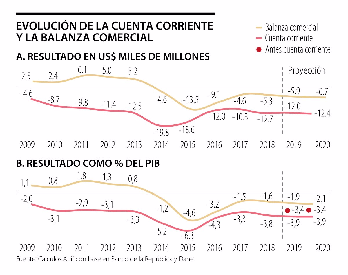 Desde finales de 2018, el Banco de la República ha venido alertando sobre el deterioro de la cuenta externa del país. Se pensaba que con la recuperación del precio del petróleo en 2018 (alcanzando US$71 barril/Brent, +30% en promedio anual), los faltantes externos se lograrían reducir hacia 2,8% del PIB (vs. 3,3% del PIB de 2017). Sin embargo, el desplome en el precio Brent de US$85/barril a US$55/barril (-35%) durante el último trimestre de 2018 afectó negativamente ese pronóstico y la cuenta externa cerró con un déficit de 3,8% del PIB el año anterior.