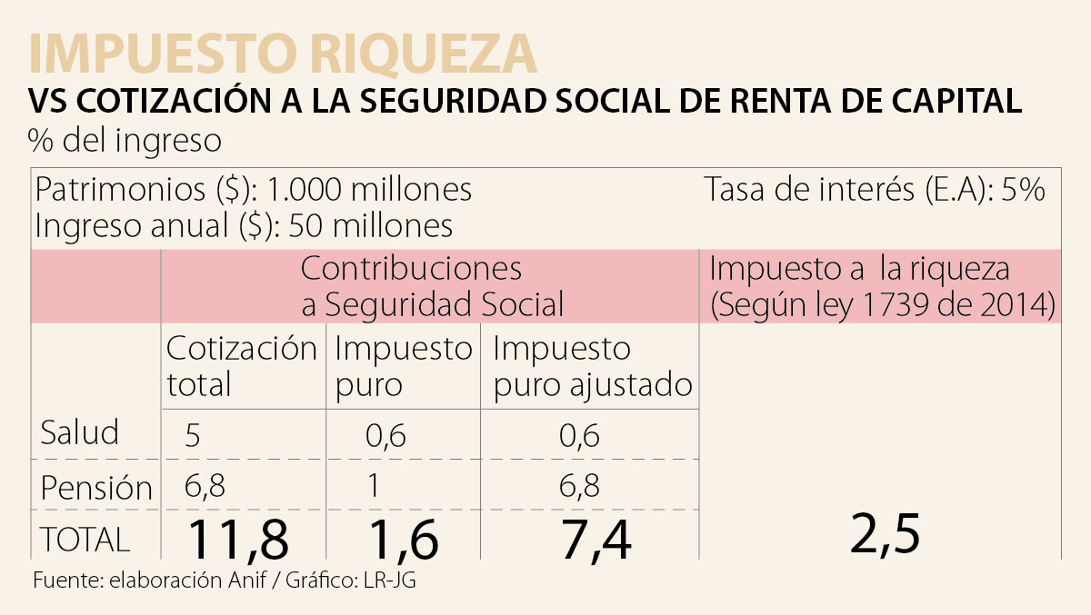 Por ejemplo, un trabajador asalariado que devenga 10 SML/mes y que, además, recibe rentas de capital por otros 15 SML/mes, está obligado por la Ugpp a contribuir sobre 25 SML/mes. En este caso, el monto de impuesto puro pasaría de 1,9% de su ingreso-laboral al 2,9% de su ingreso-total. Si ese trabajador fuera independiente, su impuesto puro pasaría del 1,6% al 2%. Así, el mayor impuesto de este trabajador estaría en el rango 0,4%-1% de su ingreso, cifra equivalente al impuesto a la riqueza que se venía cobrando a personas naturales.