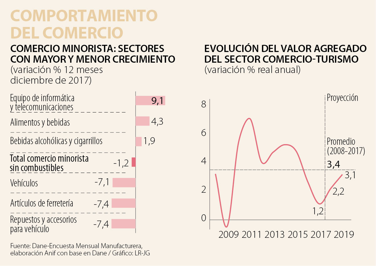 Sectorialmente, los mejores registros de comercialización durante 2017 fueron: i) equipos de informática y telecomunicaciones (+9,1% en 2017 vs. 12,1% en 2016), donde confluyen elementos relacionados con la innovación-rotación de equipos tecnológicos de uso personal y tasa de cambio favorable (apreciada) para la importación-comercialización de dichos artefactos; ii) alimentos y bebidas (4,3% en 2017 vs. 2% en 2016), sector beneficiado por el buen clima presente en gran parte de 2017, y iii) bebidas alcohólicas y cigarrillos (1,9% en 2017 vs. 5,9% en 2016), que se desaceleró, debido a las cargas tributarias al consumidor en bebidas alcohólicas y cigarrillos impuestas en la Ley 1819 de 2016, pero manteniéndose en el plano positivo.