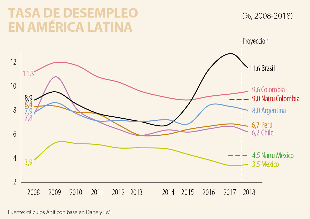Diagnóstico del mercado laboral colombiano Nuestro mercado laboral presenta uno de los mayores retos para la economía colombiana en materia de lograr incrementar de forma significativa su formalización y, por tanto, su inclusión en el sistema de seguridad social (tanto en pensiones como en los servicios de salud). Si bien se ha logrado reducir la tasa de desempleo desde valores del 12% hacia el 9%-9.5% durante la última década (acercándonos a sus niveles de desempleo Nairu de largo plazo), dicha tasa todavía resulta ser una de las más elevadas entre las economías grandes de América Latina (ver gráfico 1). Durante el período 2015-2018 se ha venido presentando un deterioro en la dinámica del mercado laboral, donde la tasa de desempleo total ha ido ascendiendo desde su punto más bajo del 8.9% (promedio de 2015) hacia los niveles actuales del 9.4%-9.6% (en 2017-2018). Más aún, el desempleo urbano ha venido escalando del 9.8% en 2015 hacia promedios año cercanos al 11% en 2017-2018.