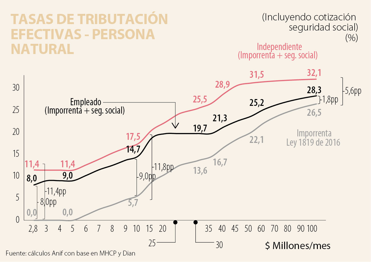 A nivel corporativo, la tasa efectiva de tributación (incluyendo parafiscales y territoriales) alcanzó el 57,7% sobre las utilidades en 2016 (ver cuadro 1). La Ley 1819 de 2016 redujo la tasa efectiva de tributación hacia el 55,8% de las utilidades en 2017 y, para 2019, bajaría al 48,8%. No parece existir margen adicional para pensar en reducir la tasa del Imporrenta más allá del 33% ya contemplado. Así, Colombia estaría por encima del 42% de carga efectiva total observada en la Ocde.