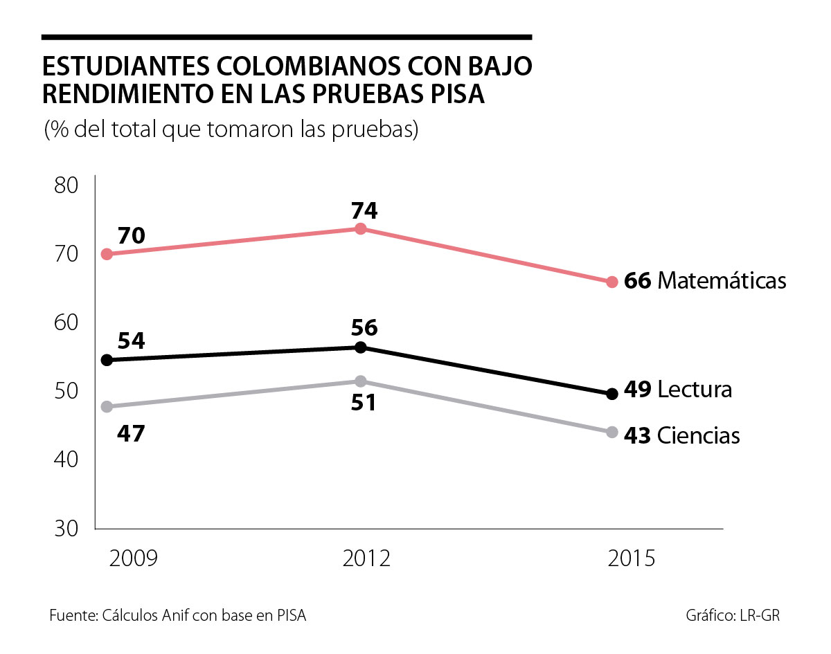 Igual podría decirse de las dificultades que tiene nuestro país en la calidad educativa, donde las pruebas Pisa continúan mostrando que 66% de los estudiantes de bachillerato son “prácticos analfabetas” al no poder utilizar las cuatro operaciones básicas de matemáticas para resolver problemas del día-a-día, ver gráfico adjunto. También se tiene un elevado índice de “prácticos analfabetas” relacionados con el lenguaje, pues 40%-50% de nuestros bachilleres es incapaz de extraer las conclusiones centrales de textos en Español, para no hablar de los bajos niveles de bilingüismo en Inglés (inferiores a 10%). ¿Colombianos: los mejores educados de América Latina?