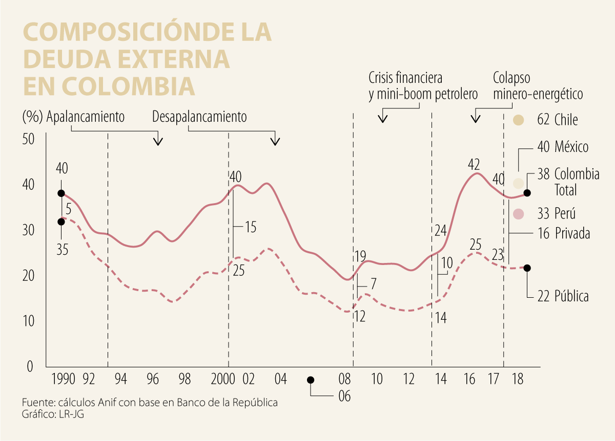 Los mencionados desafíos externos del fin del auge minero-energético explicaron el marcado incremen- to en la deuda externa-total desde el 24% del PIB en 2013 hacia niveles preocupantes del 42% del PIB al cierre de 2016 y 38% en 2018 (solo comparables con los picos de estrés de la deuda de 1990 y 2002).