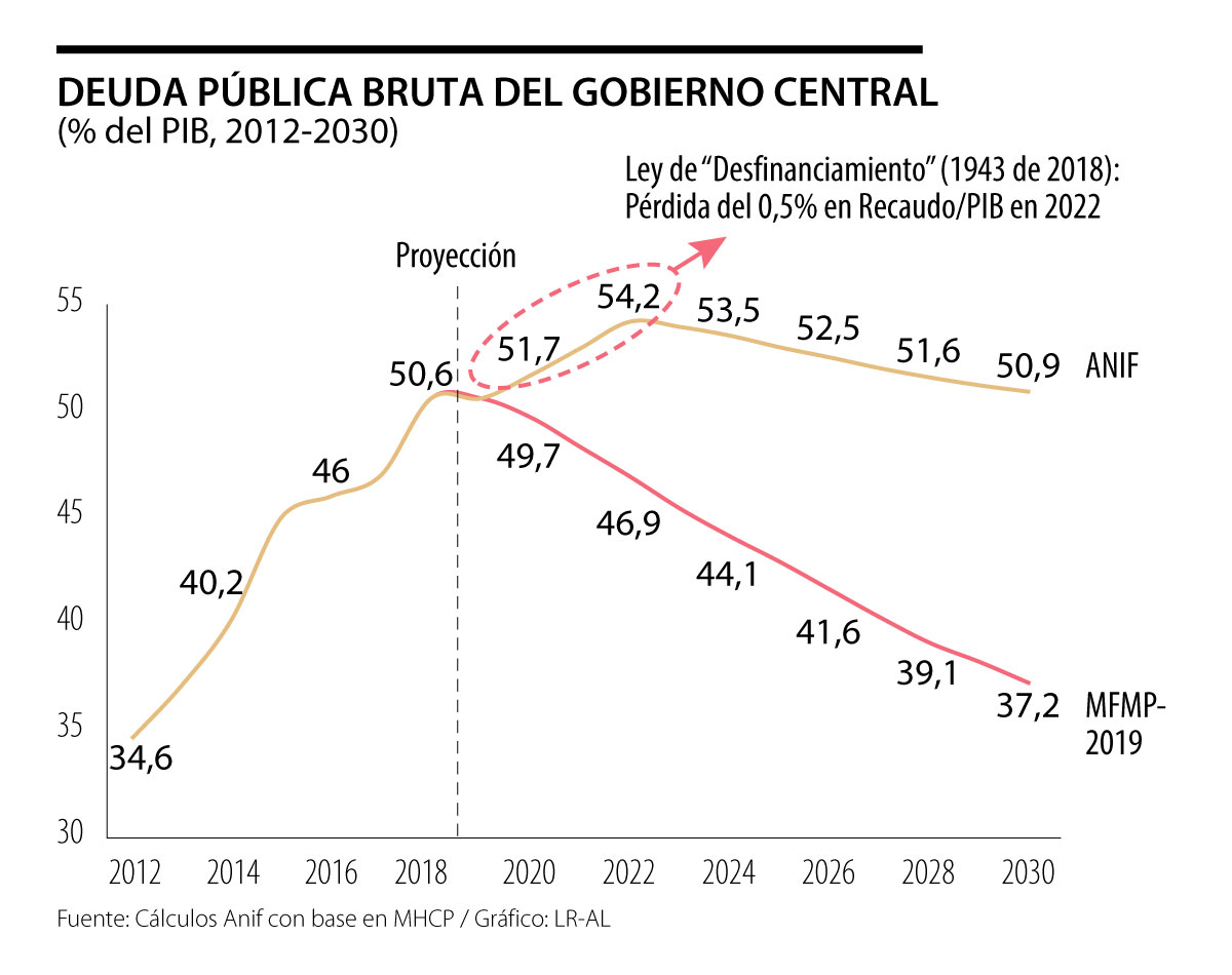 Otra parte de la respuesta tiene que ver con el hecho de que la RF de Colombia, al mirar las brechas de petróleo y de producto, pierde de vista otra serie de factores fiscales que terminan materializándose en mayor deuda pública bruta (que es la variable que todos deberíamos estar monitoreando). Tomemos el caso de los canjes de deuda que anunció la Administración Duque a finales de 2018: estaban programadas amortizaciones de deuda hasta por un 2% del PIB durante 2018-2019, que finalmente no se hicieron al optar por extensiones de esos vencimientos. Esto último causó incrementos en el stock de la deuda que no estaban programados, lo cual mejora la caja del gobierno, pero eleva el pago de intereses en años venideros.