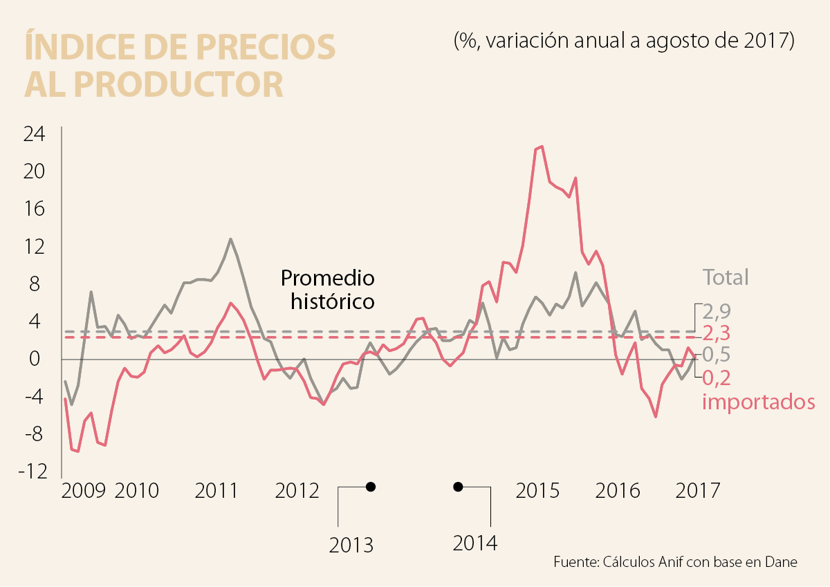 En síntesis, la inflación anual del IPP se redujo de 2,6% en agosto de 2016 a 0,5% en el mismo mes de 2017. Ello estuvo determinado principalmente por las menores presiones de costos vía pass-through, donde la variación de los precios de los importados se ha mantenido estable y baja en niveles cercanos a 0,2%, gracias a una apreciación cambiaria de 5% anual. También incidieron los menores costos del agro (-12% anual en agosto), una vez disipados los efectos del fenómeno de “El Niño” y del paro de transportadores, sumado a los excesos de oferta de algunos productos derivados del programa “Colombia Siembra”.
