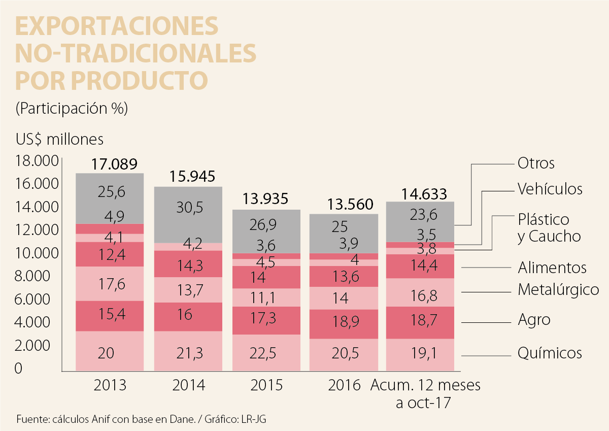 Las exportaciones no-tradicionales del país tan solo alcanzaron los US$14.633 millones en el acumulado en 12 meses a octubre de 2017, cifra que no solo resulta inferior al pico de los US$18.336 millones logrados en 2012, sino que también refleja un estancamiento del componente no-tradicional. El 70% de este tipo de exportaciones se concentró en cuatro clases de productos, evidenciando su bajo nivel de diversificación. Estas cuatro clases fueron: i) químicos (19,1% del total); ii) agropecuarios (18,7%); iii) productos metalúrgicos (16,8%); y iv) alimentos (14,4%).