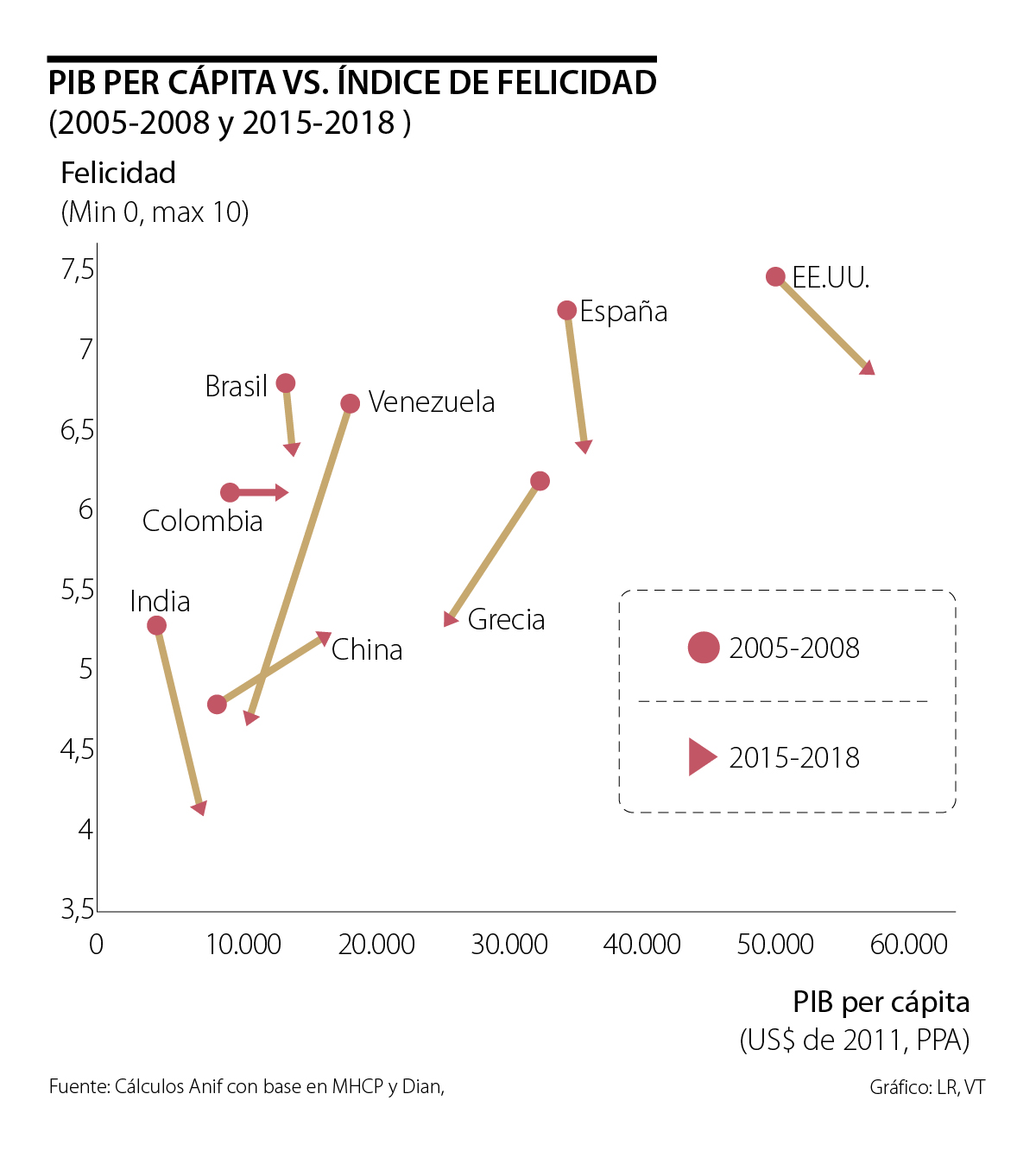 Esta situación contrasta con lo ocurrido, por ejemplo, en Grecia. Allí se observó una caída más marcada en el índice de felicidad (casi 1 punto), pero en este caso sí se tuvo como contrapartida un descenso importante en el PIB-real per cápita (pasando de niveles cercanos a los US$35.000/año hacia los US$25.000/año, en US$ constantes de 2011 y ajustando por PPA).