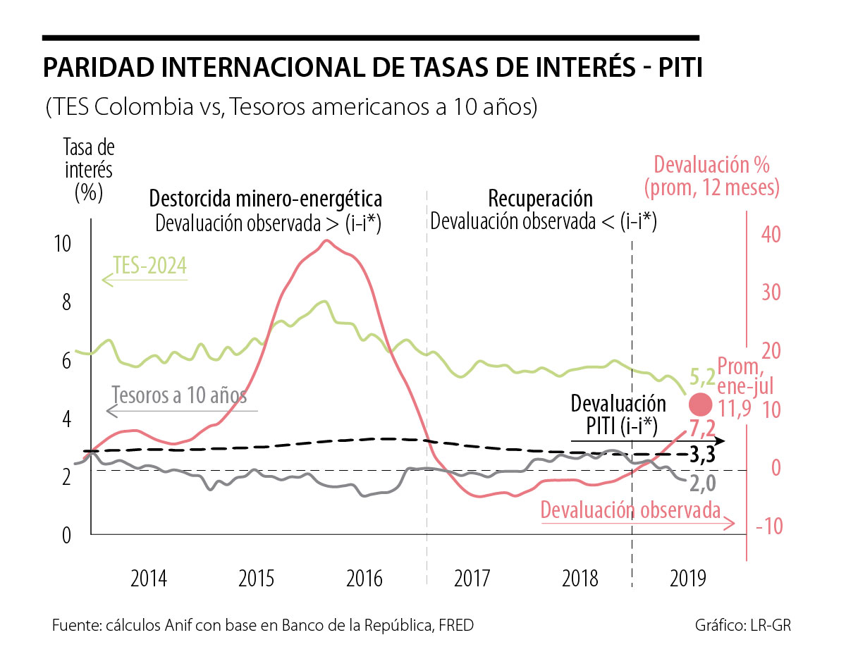 Así, esta coyuntura resulta apropiada para analizar los flujos de capital y el efecto de la llamada Paridad Internacional de Tasas de Interés (PITI). Como veremos, la aceleración de la devaluación peso-dólar (antes comentada), si bien ayuda a promover el sector real exportador no-tradicional, según la PITI, dicha devaluación estaría mostrando riesgos de salidas de capitales (antes de tener que liquidar a $3.400/dólar los réditos generados en Colombia).