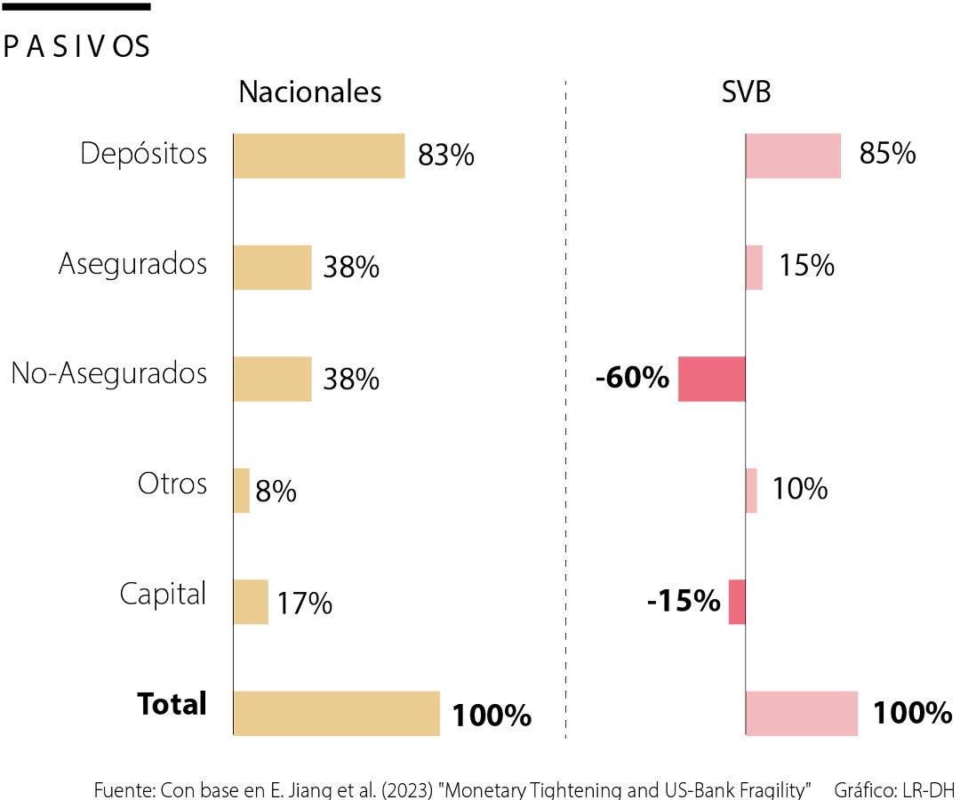 Y la tercera área que debe investigarse con mayor profundidad es la relacionada con el papel que venía cumpliendo el sistema de aseguramiento bancario oficial, cuyo eje central ha sido, ya por décadas, el Fdic. Esta entidad pública administra los recursos de aseguramiento hasta por US$250.000 por deposito individual, cobrando tasas en el rango 0,05% a 0,32% del valor depositado (ver Clavijo y Vera, 2023 “Banca Central...” Editorial Tirant). Lo curioso es que en los casos de los bancos regionales quebrados se encontró que cerca de un 60% de sus depósitos no estaban asegurados, cifra significativamente inferior a 38% que no estaba asegurado a nivel nacional (ver cuadro adjunto).